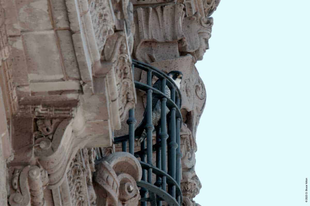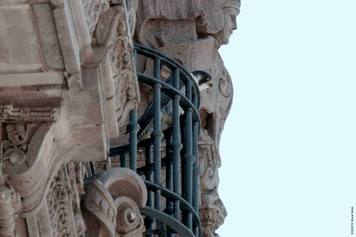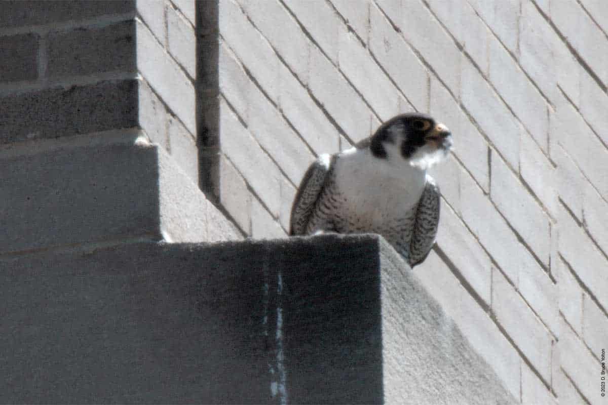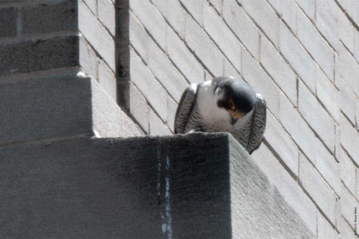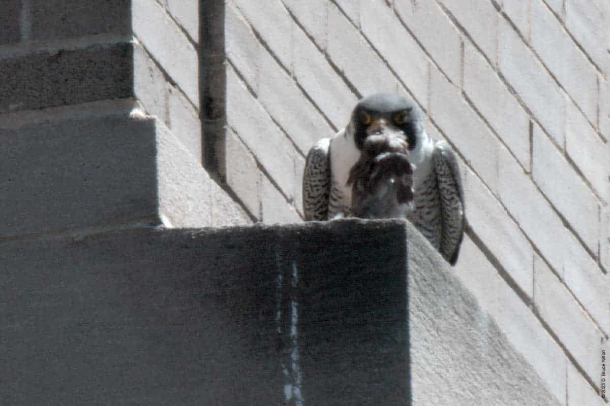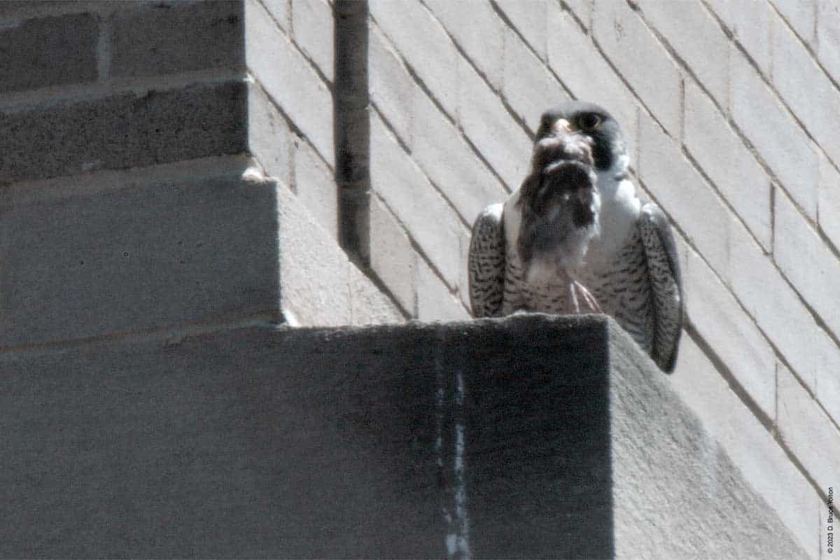 I watched the parents from the street, and got to see the adult male clean the feather’s off a Rock Pigeon, deliver it to the nest, and then swap places with the adult female. The young falcons made lots of noise when the food was delivered.