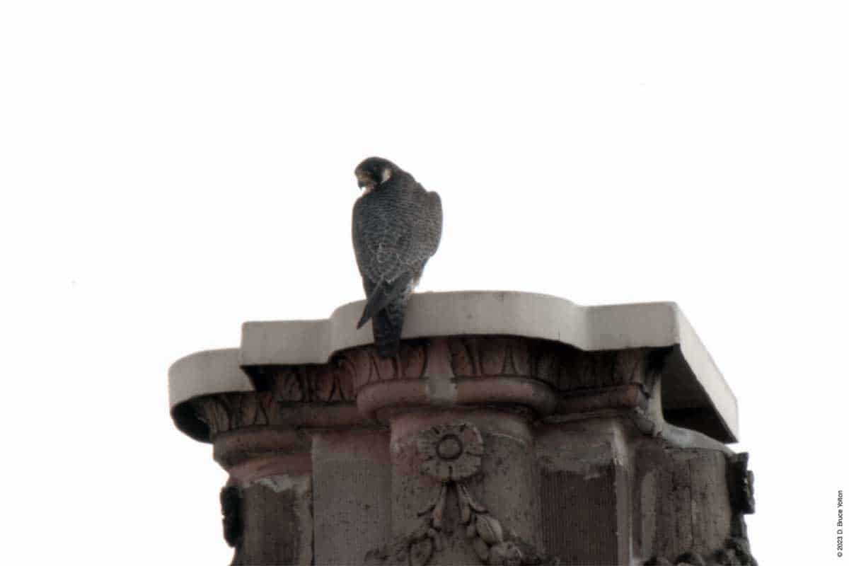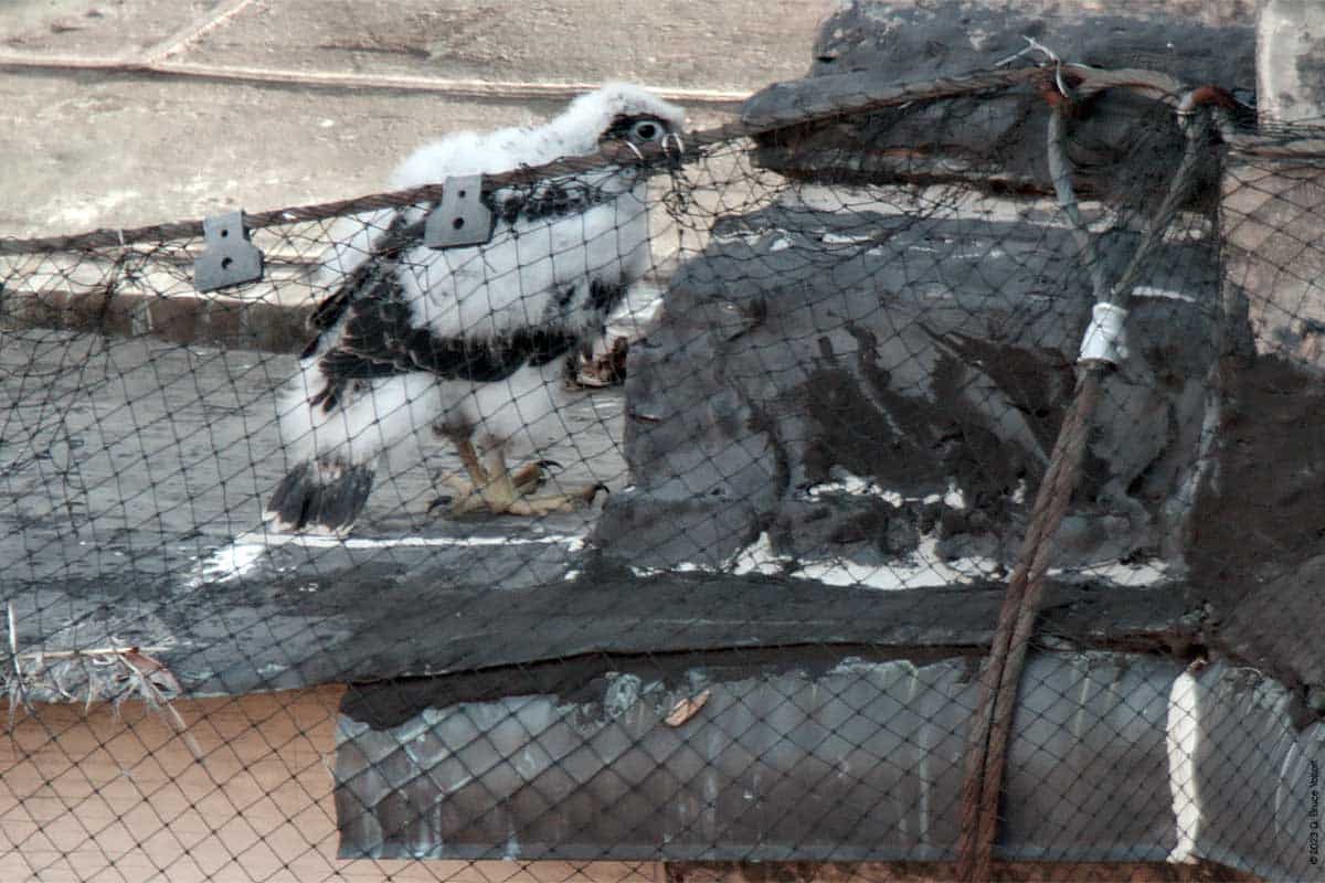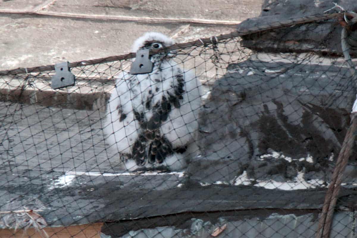 I’ve been waiting for the day, the eyasses (young falcons) could be seen from the street. Last year, I could see them on May 26th. This year, it was today, May 31st. Today, I only saw one, but suspect I’ll see more than one in the upcoming days.