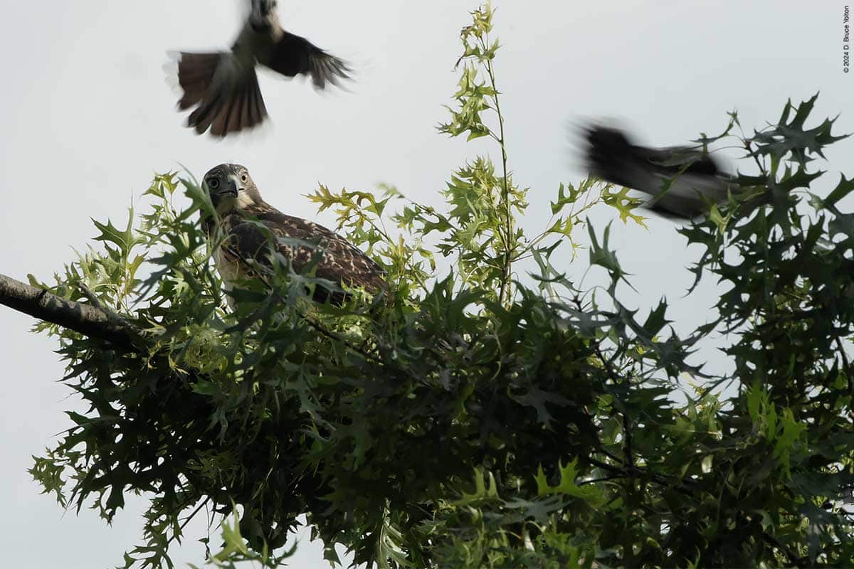 When I arrived one fledgling was on the north side of the courts being harassed by Blue Jays. The fledgling moved to a number of trees, but the harassment continued. Finally the fledgling went to a tree above the tennis center building. It joined its other two siblings.