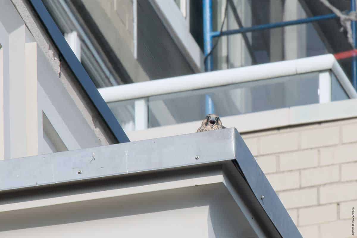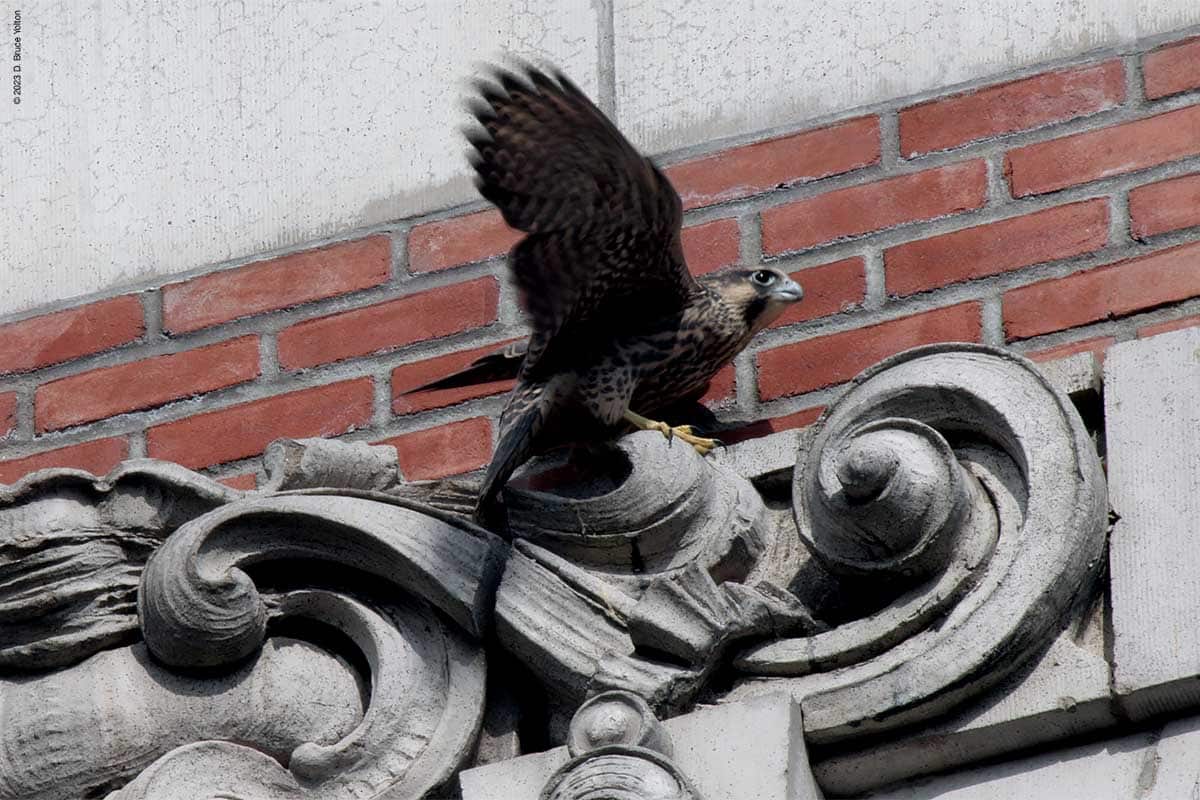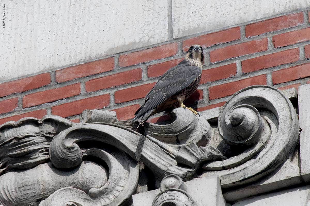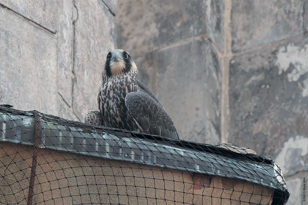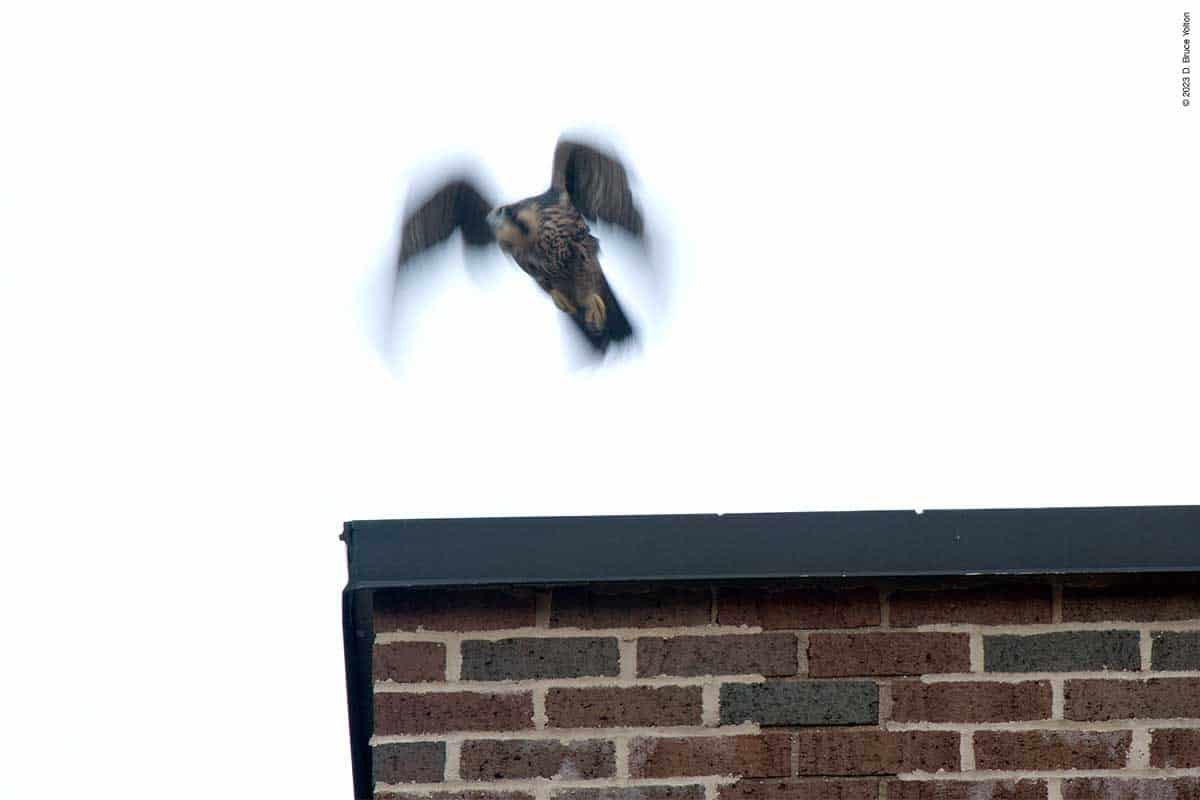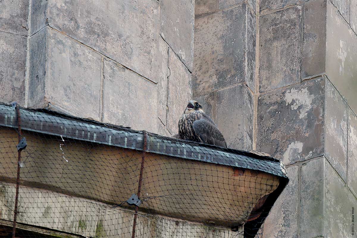 After I packed up my camera, the last youngster to fledge left the eyrie! I had to leave but other say two fledglings eating on 255 West 85th Street and another fledgling chasing pigeons.