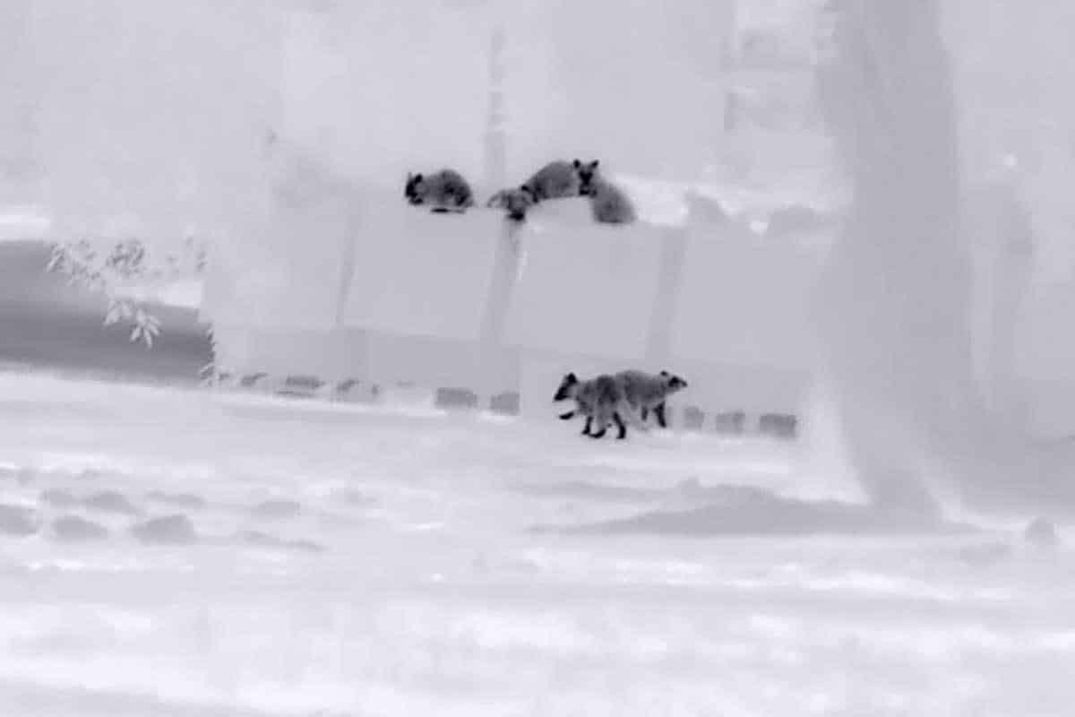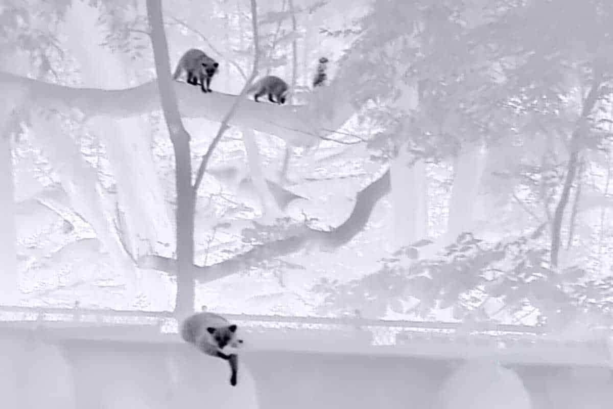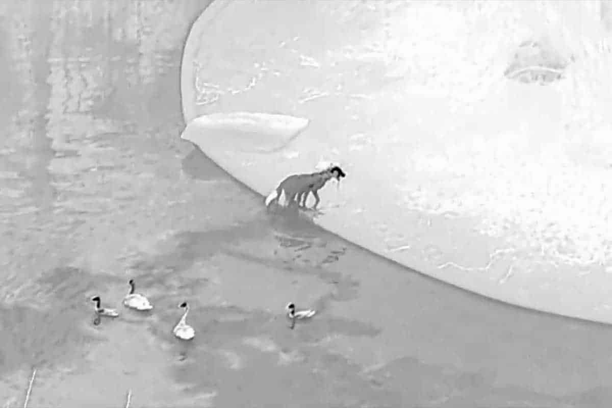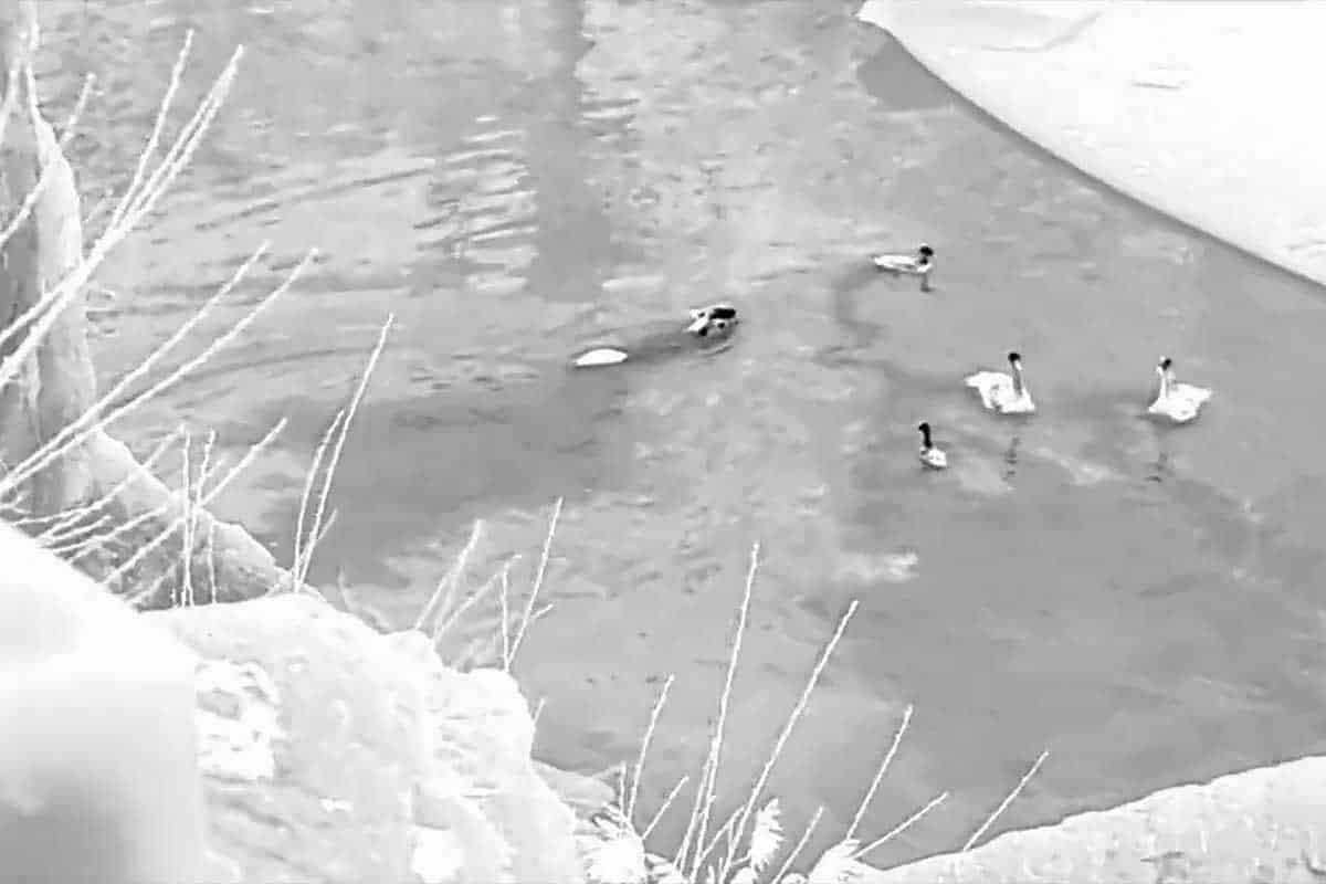 I’ve only been able to take one thermal movie and extract some stills of the coyotes swimming. There isn’t snow in the image below, black is heat, and white is cold.