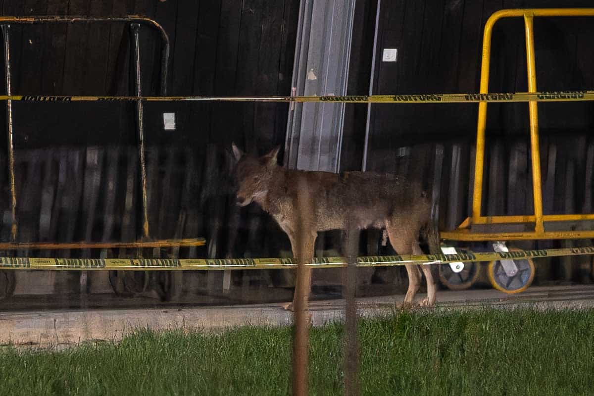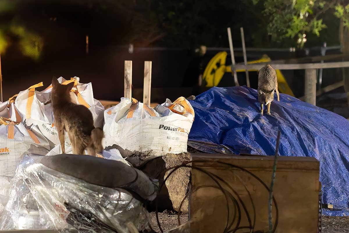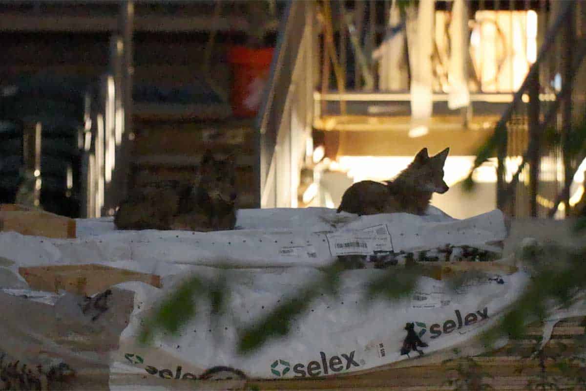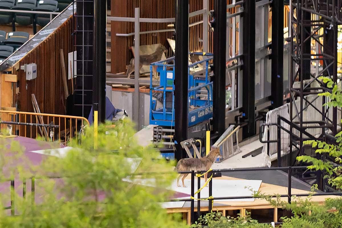 The coyotes would also use a fenced in construction area just north of the theater at night to rest and relax. Below are photographs from May.
