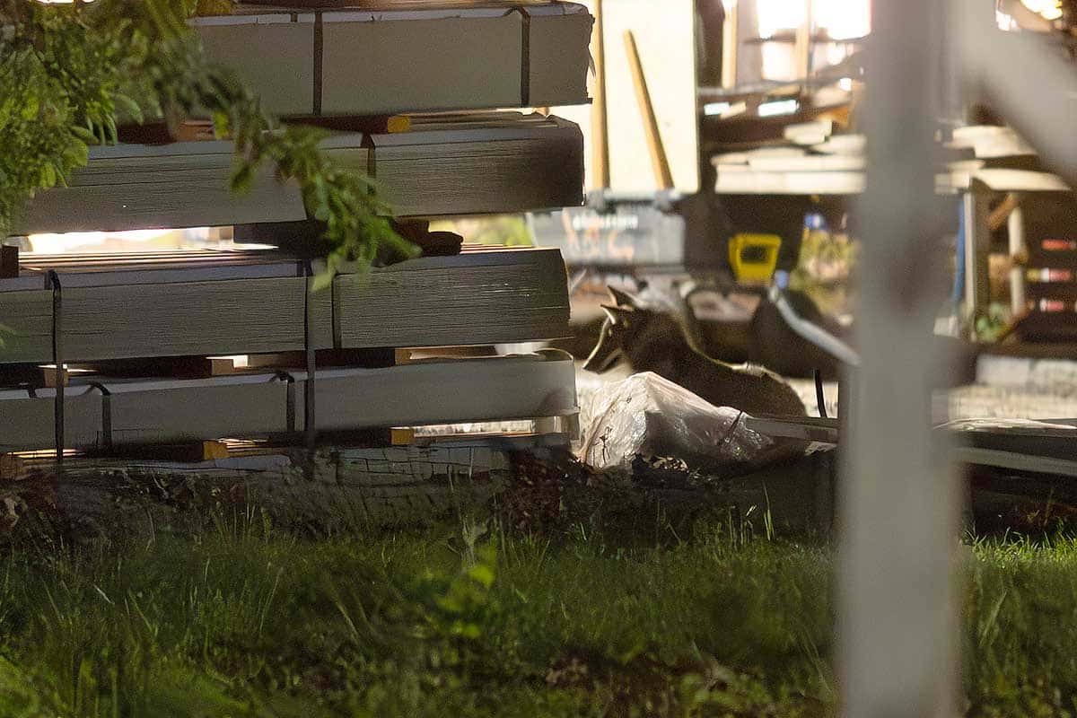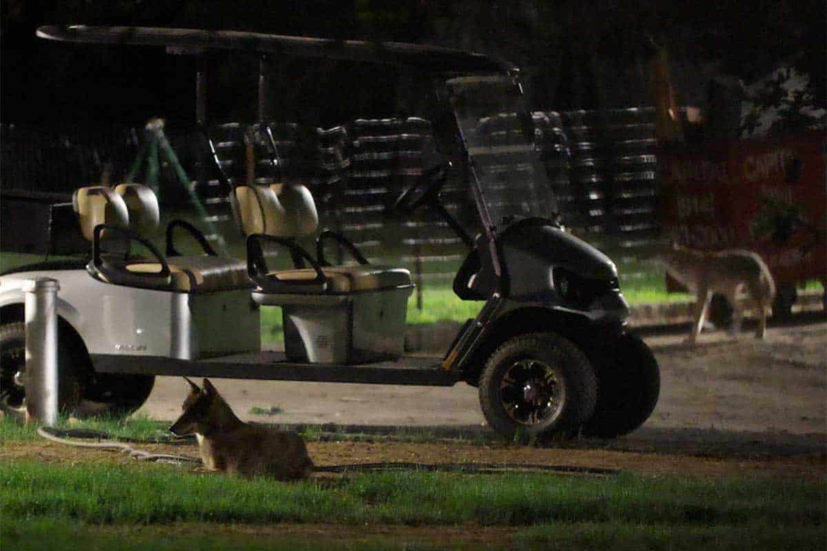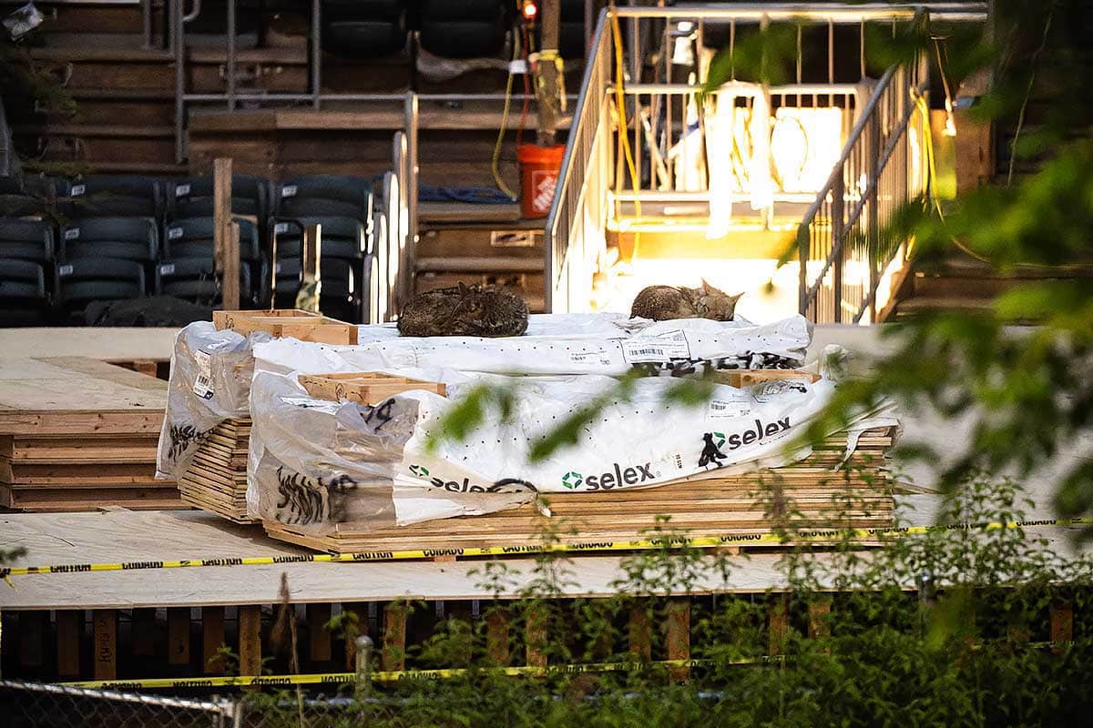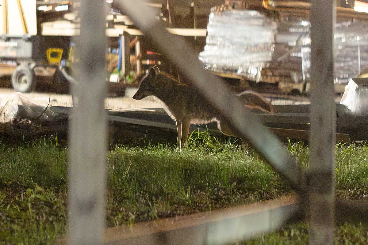 The coyotes would also use a fenced in construction area just north of the theater at night to rest and relax. Below are photographs from May.