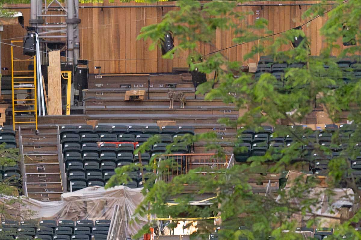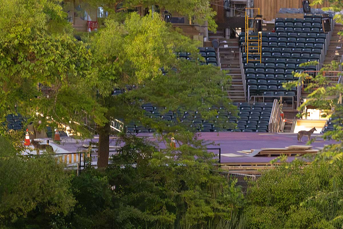 Now that the construction has been completed and rehearsals have started for the August production of Twelfth Night, the coyotes are avoiding the theater from what I can see. They are very shy. They used the theater when it was dark, and now stage lights keep the theater lit all night. The coyotes have plenty of other places to hang out in the park, and they’ll be just fine giving up their playground to the Public Theater for a few weeks!