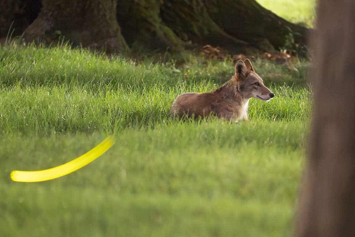 A firefly photobombs one of the coyotes in July.
