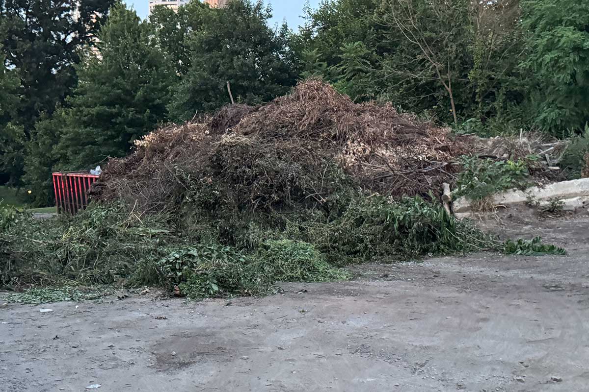 The Mount which used to be free of debris have been left a complete mess by the contractors who worked on the Davis Center and Conservatory Garden. (This seams to be par for the course this season. In Shakespeare Garden, to meet an opening deadline, the lattice work for the new rustic fences was left unfinished and the lumber thrown behind some shrubs.) A cynic would say that it shows the lingering racism and classism of the Conservancy’s staff and board, that an acre of the park “uptown” has been left in such disrepair. Or it simply is incompetence. Either way, the site needs to be restored to a natural state and a better solution found for the dumpsters.