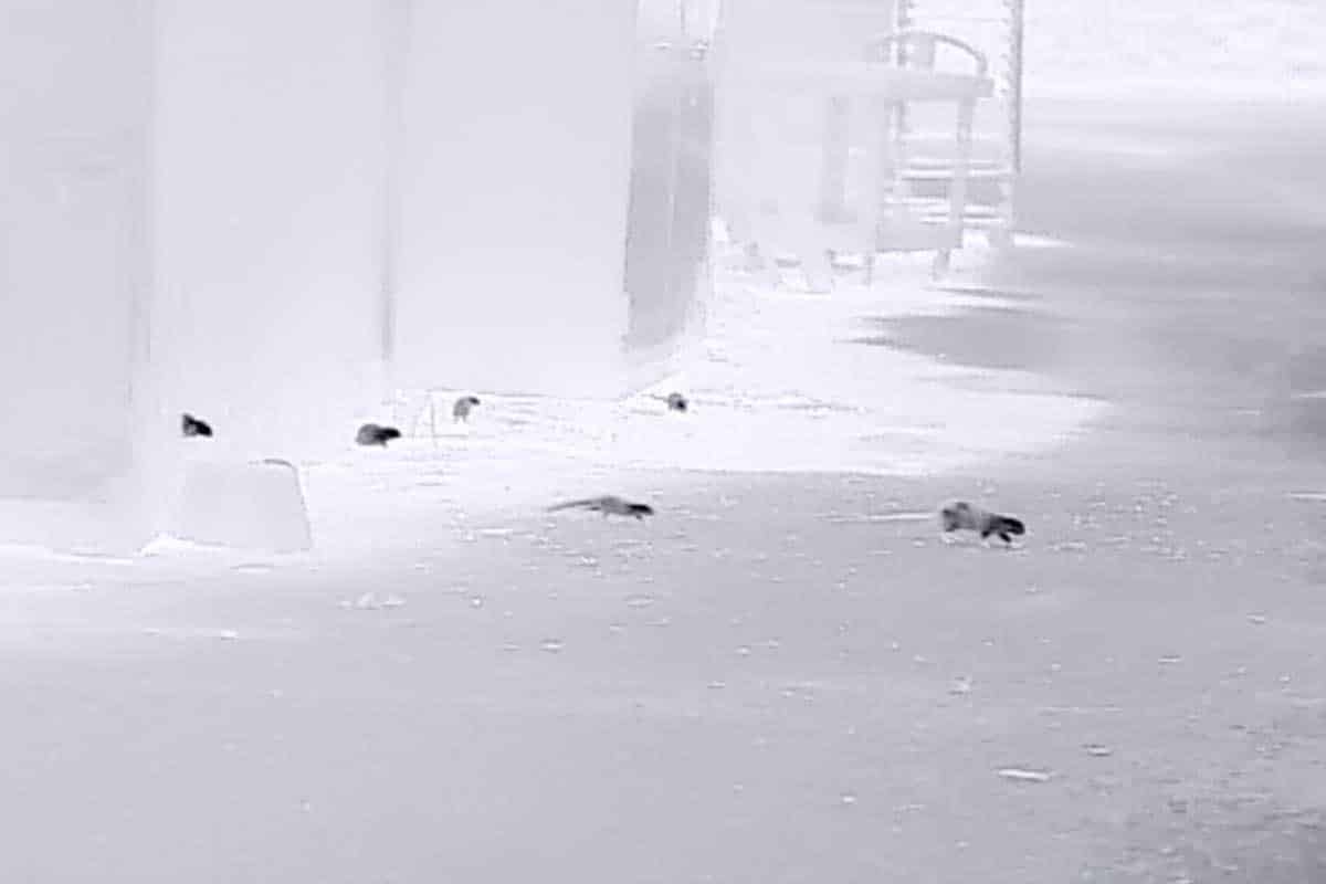 This is a thermal image of them. Black is heat, and white is cold not snow. Here they are exploring the theater with most of the seats still to be installed.