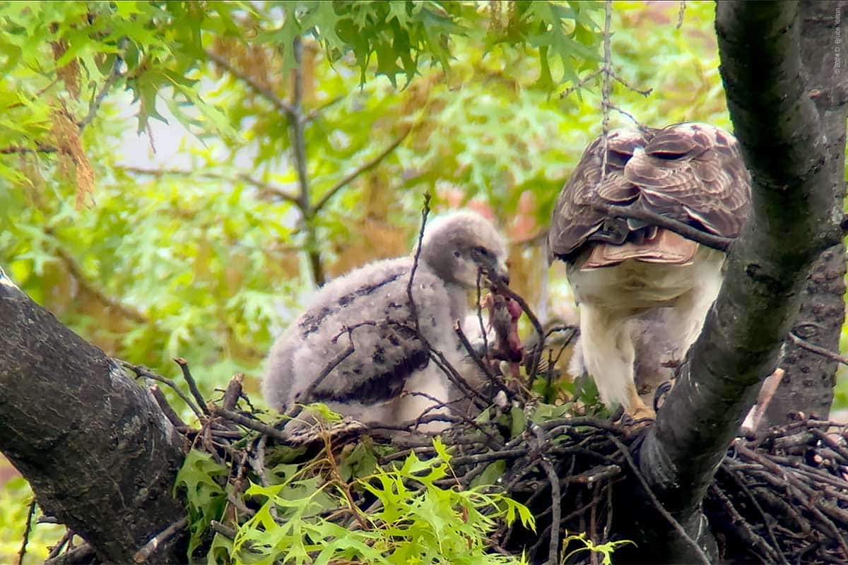 Red-tailed Hawks often raid American Robin nests, but today I saw my first robin nestling be delivered to a nest. The eyasses had a hard time dividing it up a the three of them kept stealing it from each other. Young hawks need to be able to feed themselves before they leave the nest, so a nestling robin made a good first do it yourself meal.