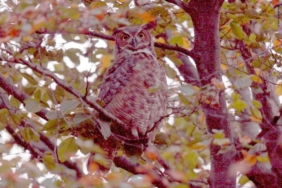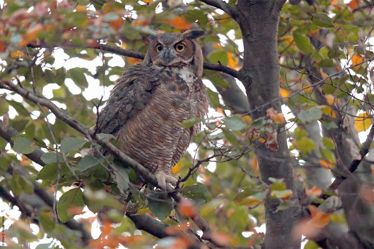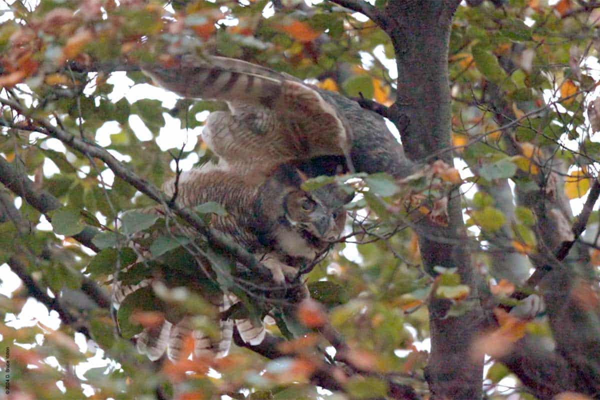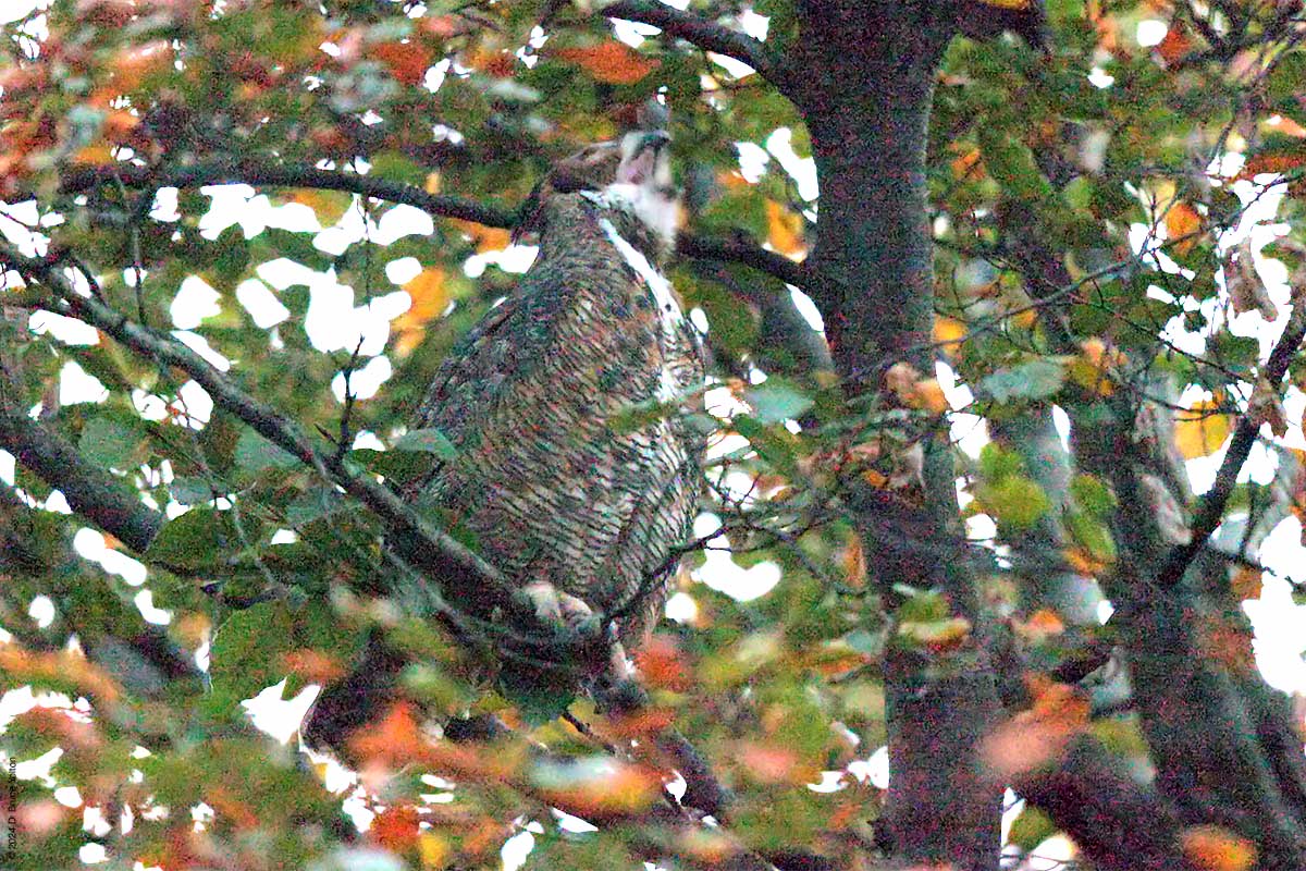 On Saturday, I was happy to find the Great Horned Owl that had been reported being in the park for a few days. I walked under an oak tree, which had been a roosting location of owls in past years to find a huge amount of white wash on the ground. I looked up and there was the owl.