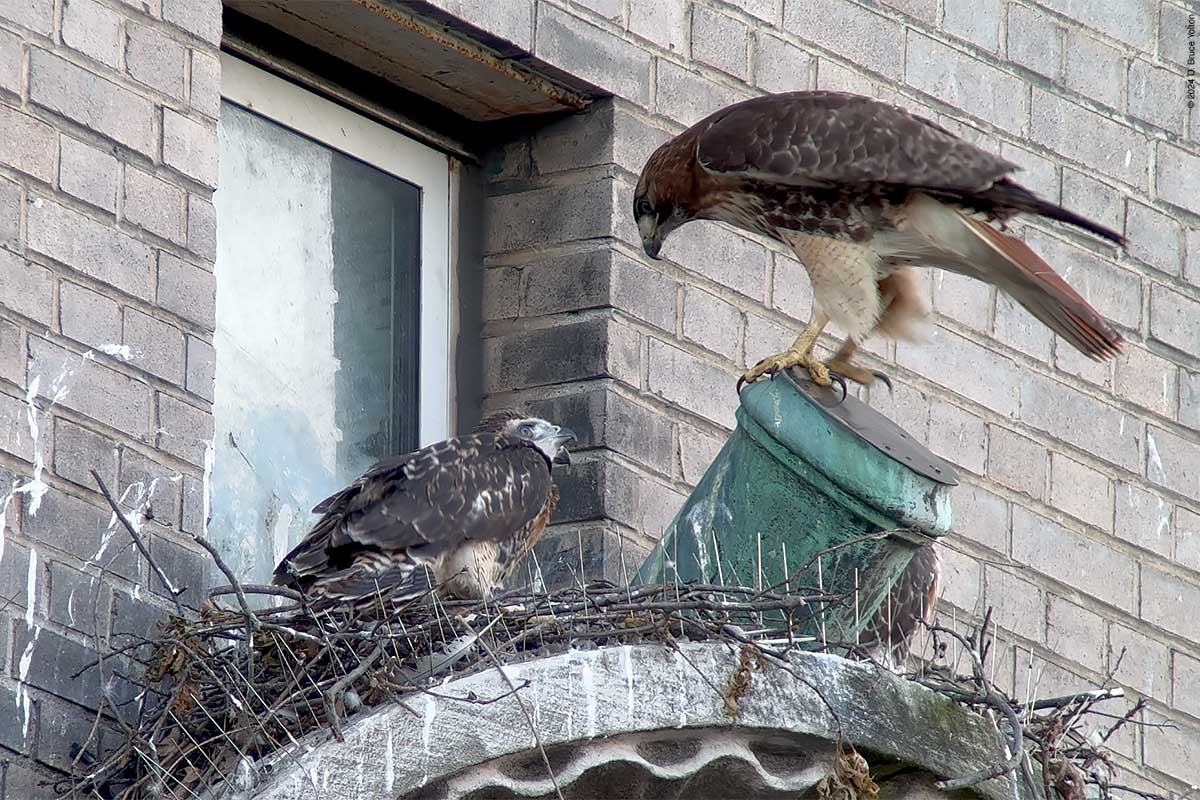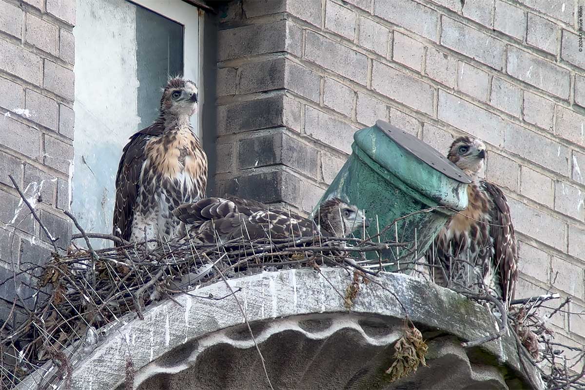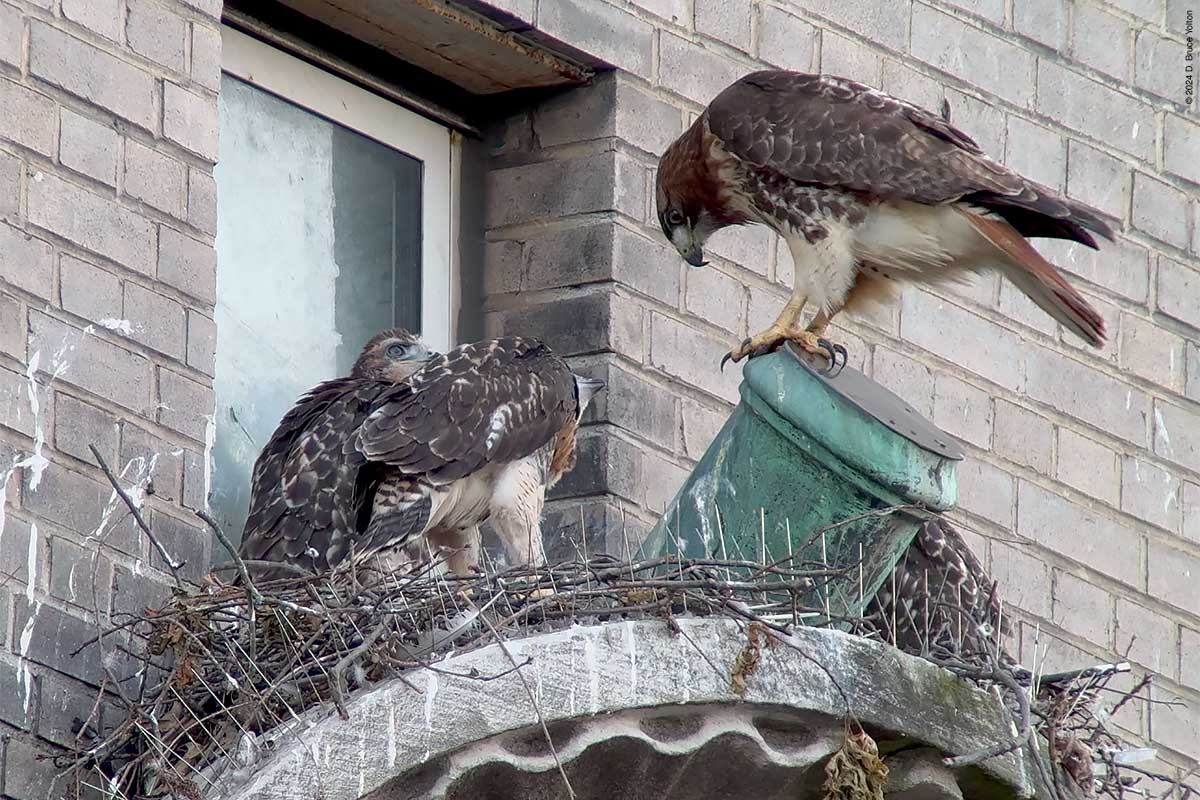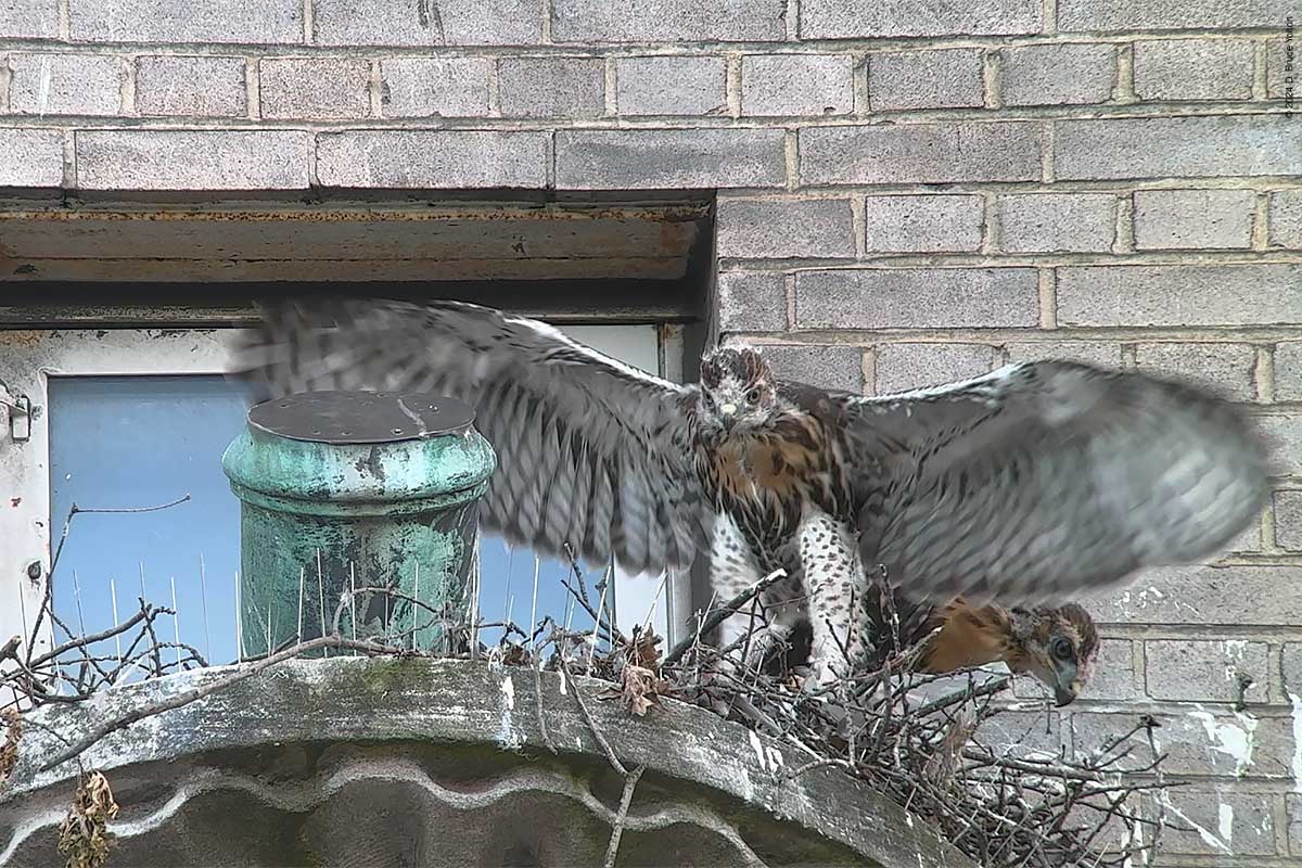 The two eyasses still on the nest were very active, and look ready to follow their pioneering sibling. The mother made a good number of visits to the nest as well. I’m looking forward to the summer and watching these hawks grow up.