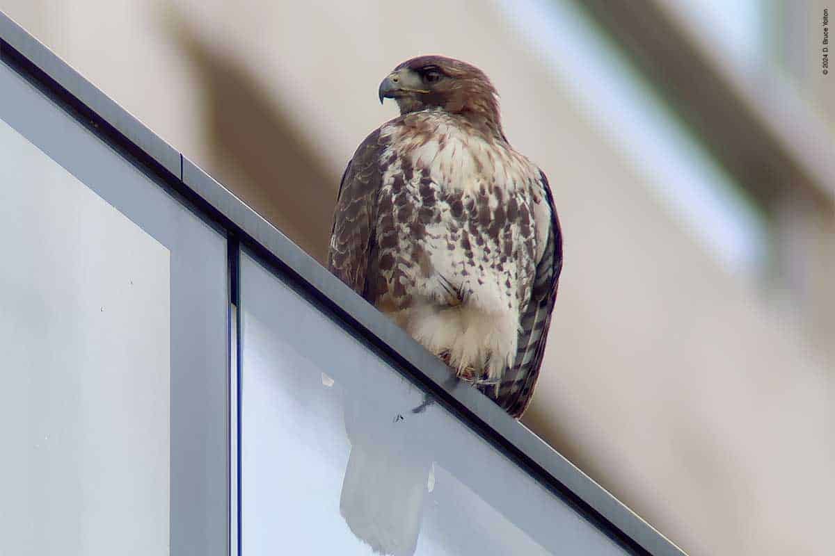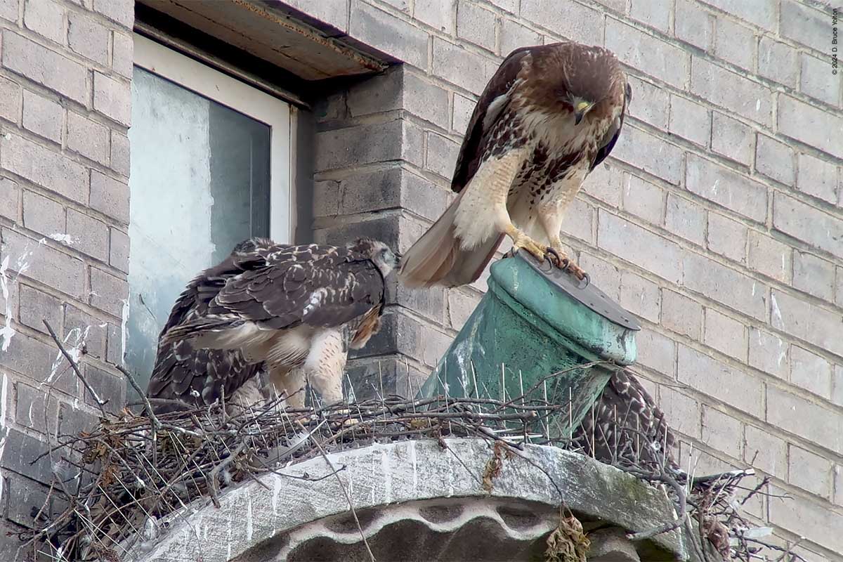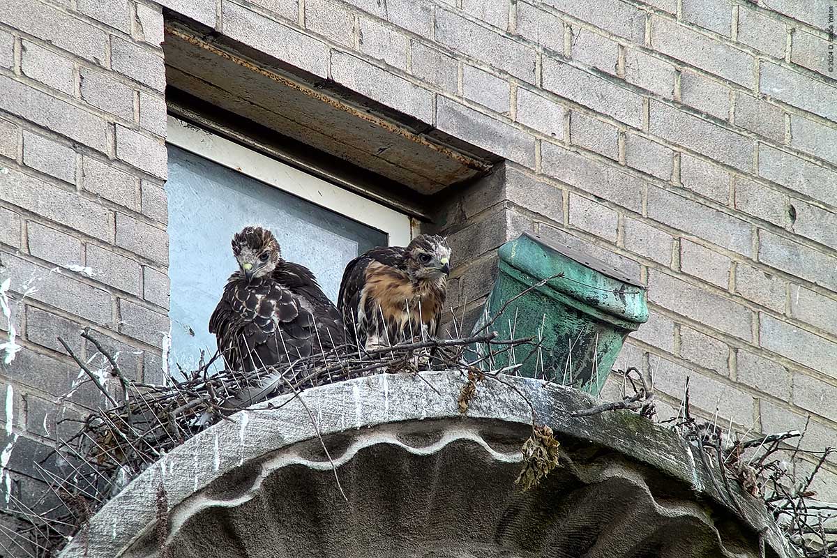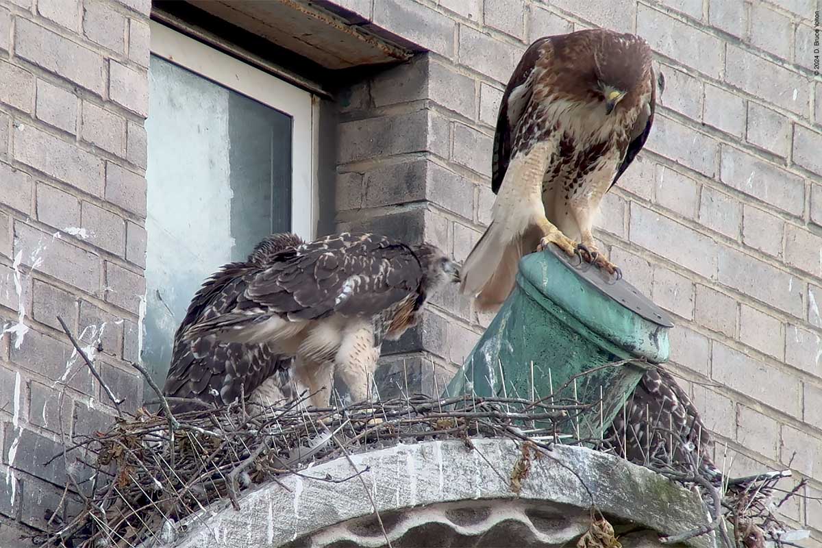 The two eyasses still on the nest were very active, and look ready to follow their pioneering sibling. The mother made a good number of visits to the nest as well. I’m looking forward to the summer and watching these hawks grow up.