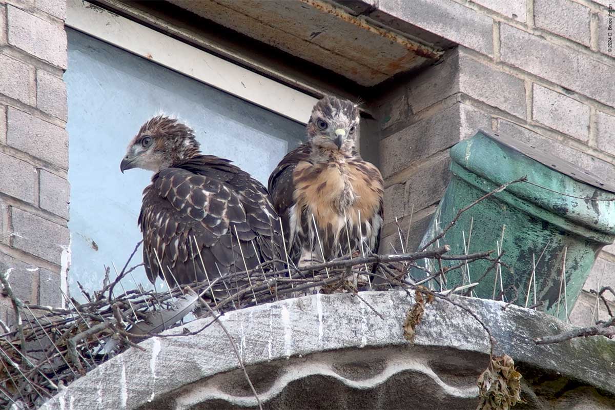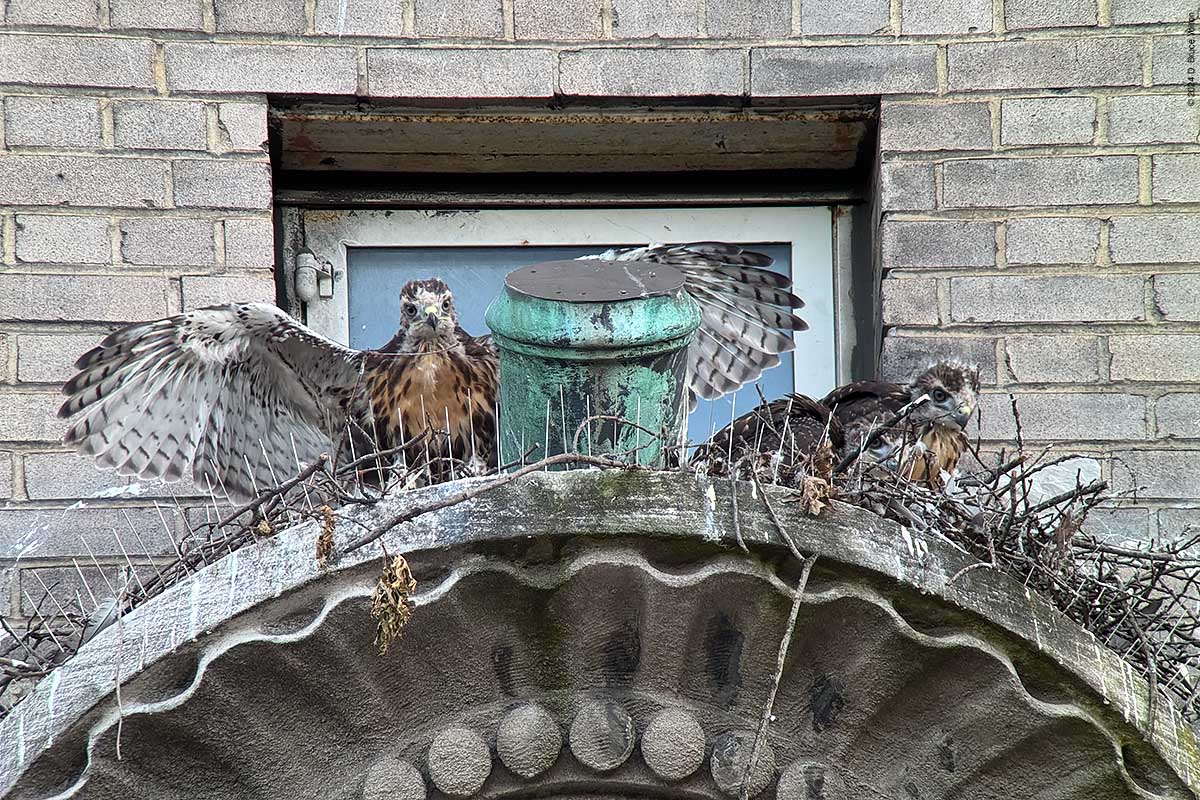 The first fledge occurred at the New York Athletic Club on Tuesday morning. Reports are two of the eyasses were fighting over who would get to perch on the flag pole mount, and one end up fledging. It landed safely in a tree about 100 feet north of Central Park West.