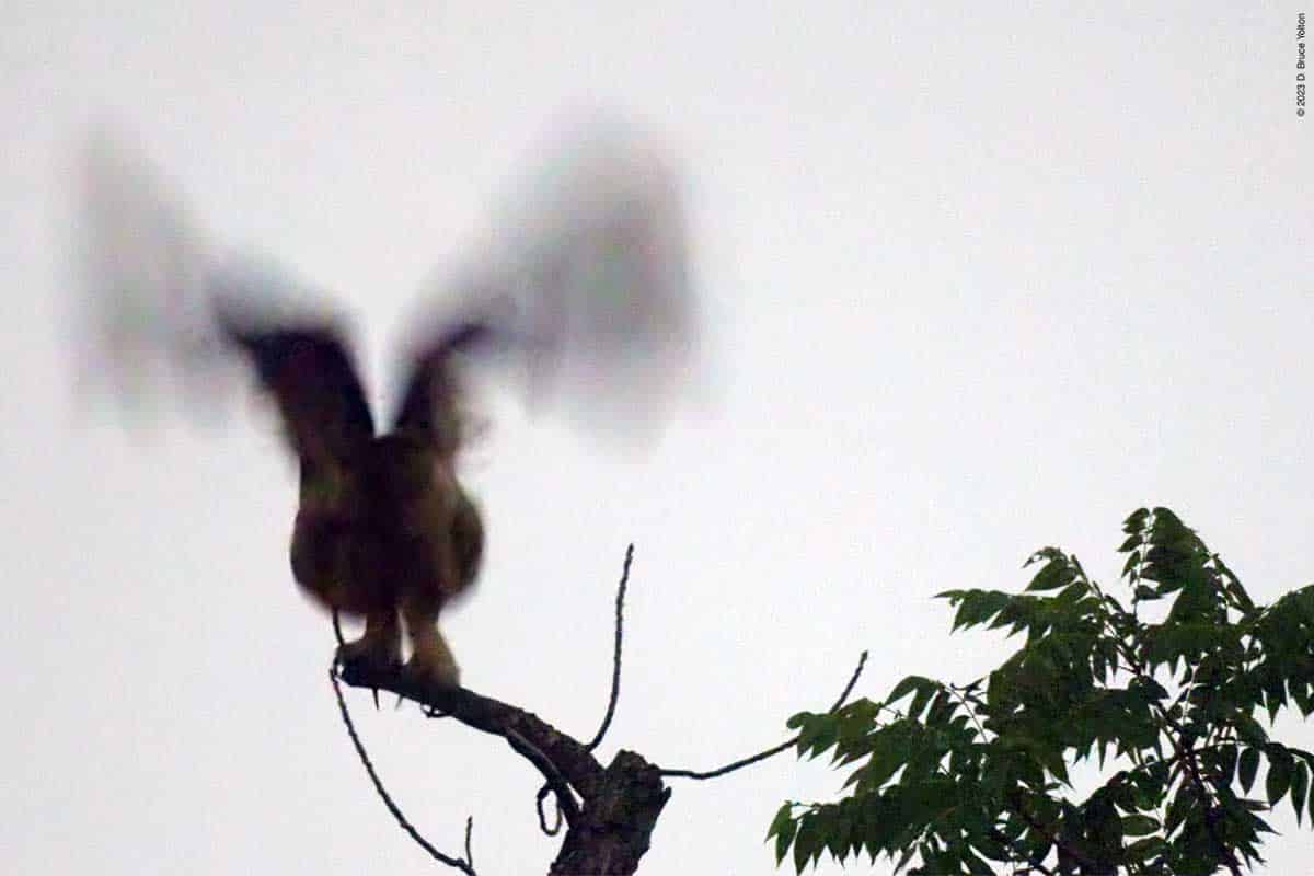 I had been coming to see Flaco right around his fly out time, so I came a bit early today. He got visited by some Fish Crows and American Robins and did a bit of stretching before fly out. It was then to a grassy compost hill, just like the night before where he stayed for a long time before flying to a Black Locust tree. He then flew to one of his favorite trees before we lost track of him.