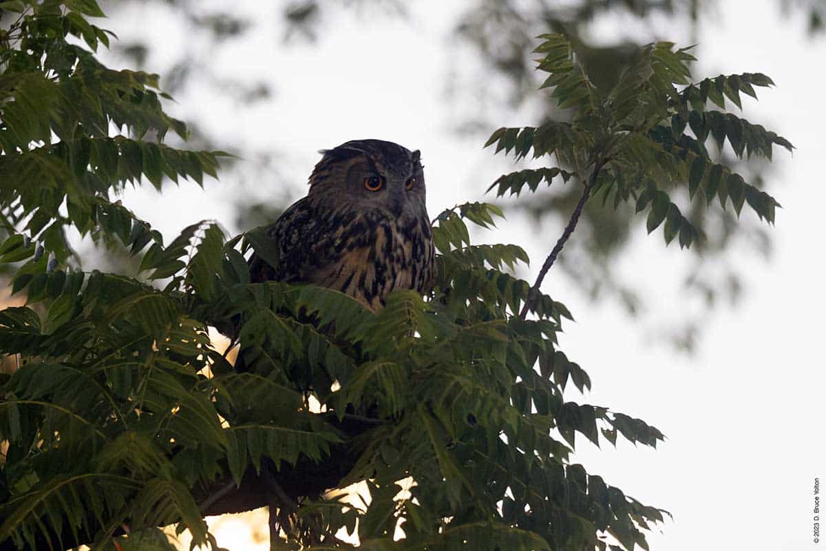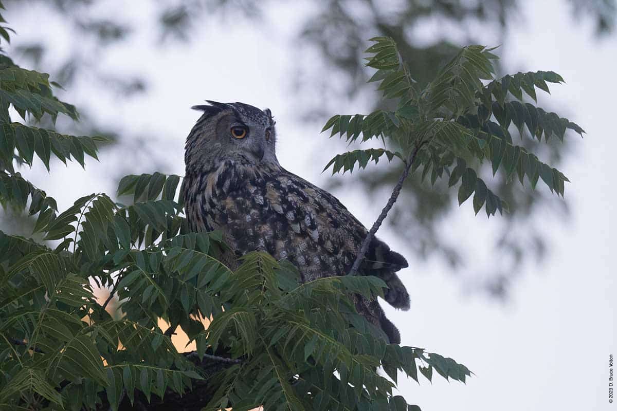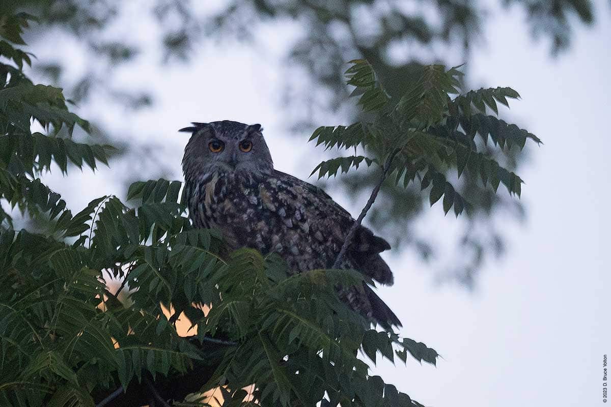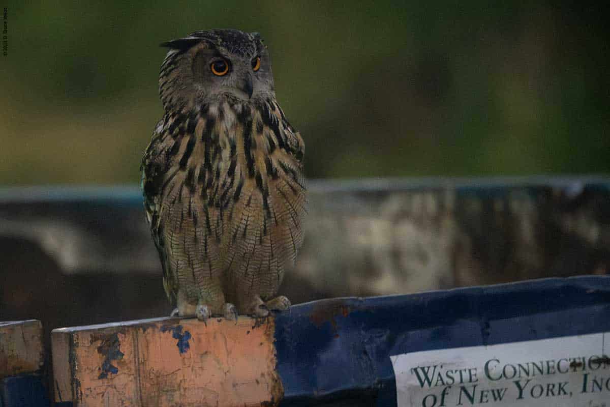 On Wednesday evening, a few of us got some great looks at Flaco as he flew around landing on dumpsters, a concrete pipe, and various trees and perches including a few on the ground. But most surprising was his jumping into a puddle and taking a drink. This was the first time I had seen him in water.
