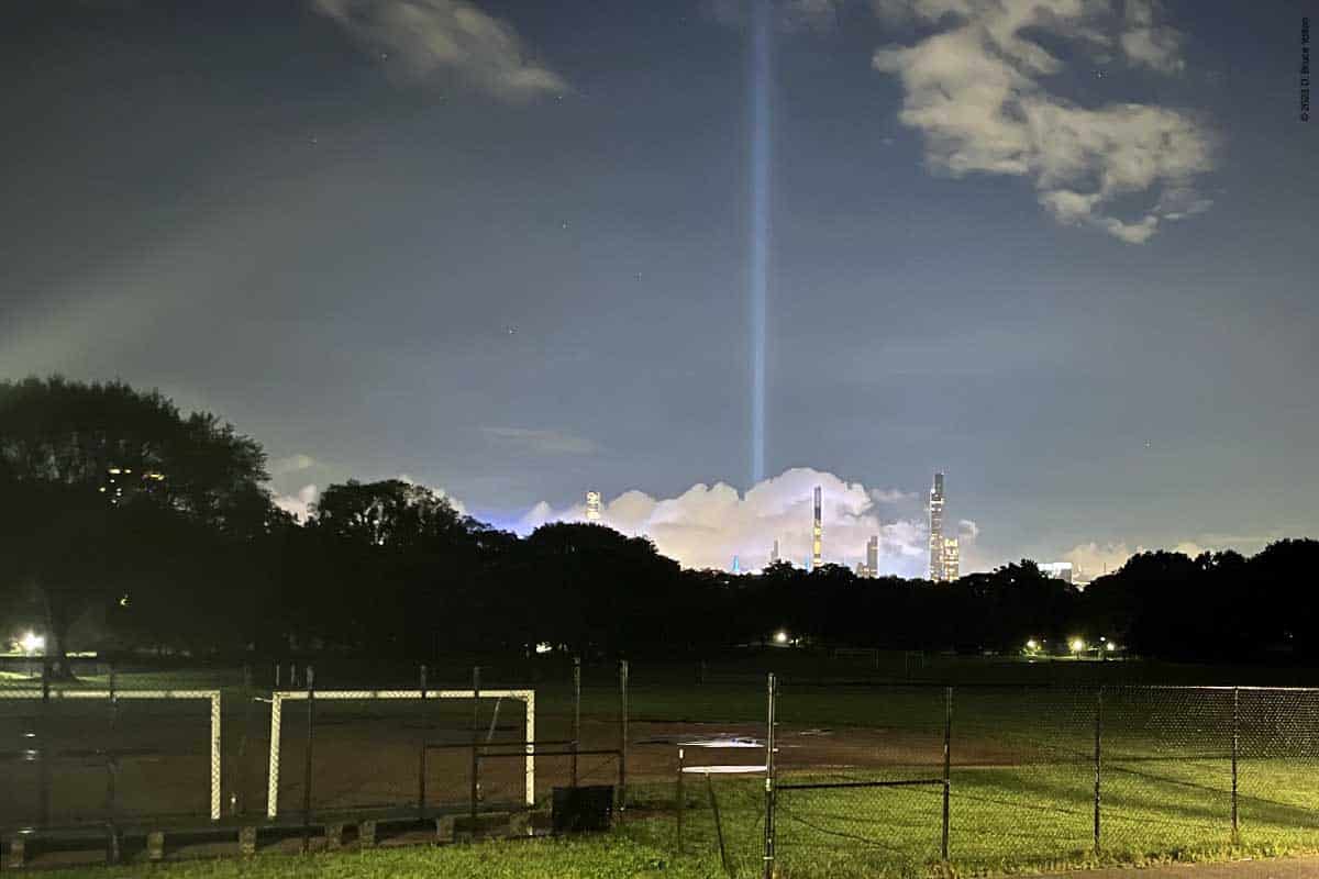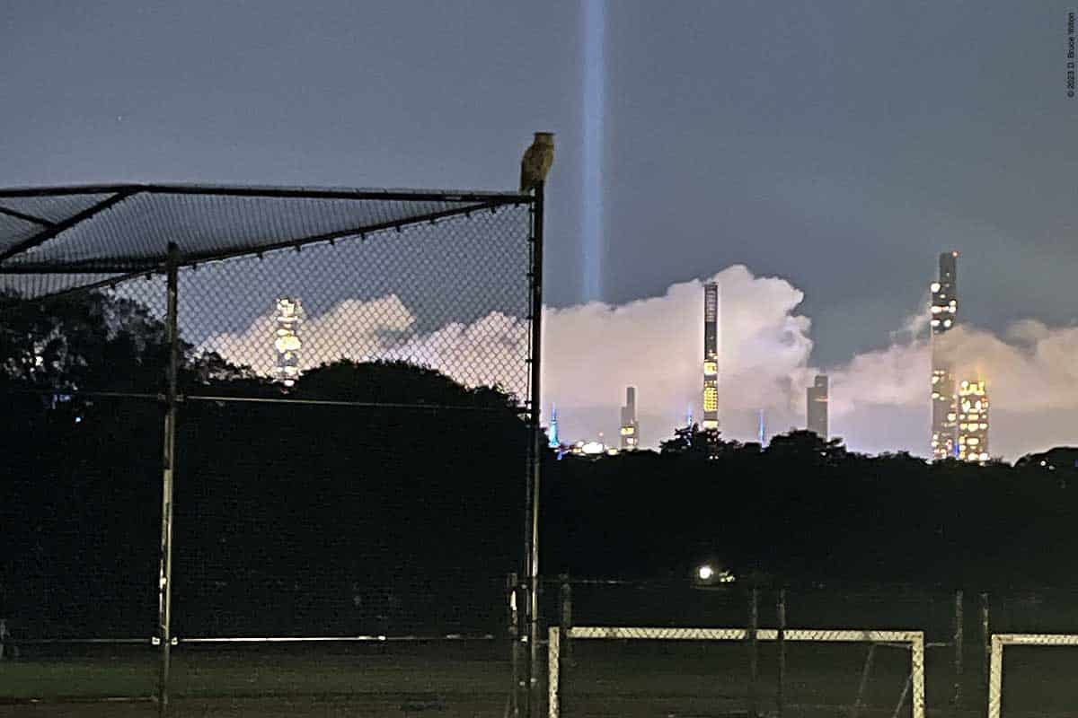 The North Meadow is switching from Baseball to Soccer and after fly out Flaco was reported to be exploring the new goals. I arrived afterwards, although I had seen him briefly in the afternoon. While I was with him, he calmly stayed on a backstop, with the Tribute in Lights shining behind him. Later he finally took off and I found him on a streetlight over the West Drive.