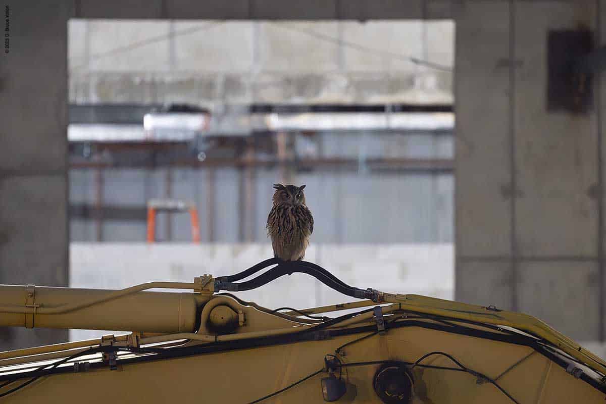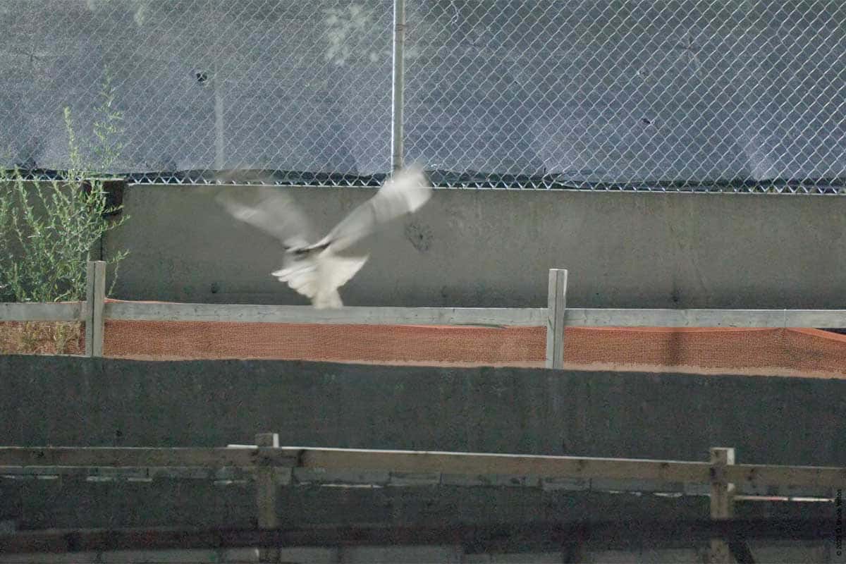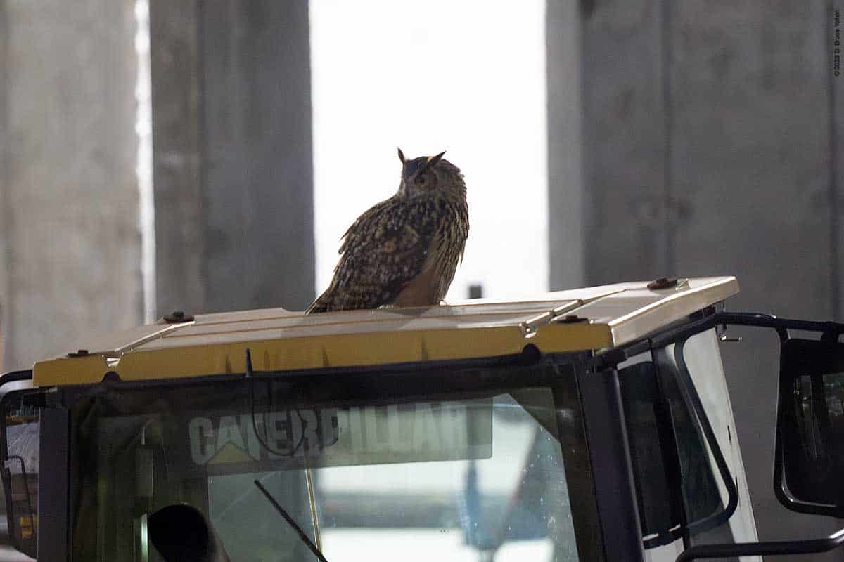 Over the last month, enough work has been done to allow the night watchman for the construction to now go over the roof walkway, through the building and then check on the equipment located where the rink/pool will eventually be built. However this means that while making his rounds, he sometimes flushes Flaco. Now that the route is longer, Flaco seems to be getting flushed more often.