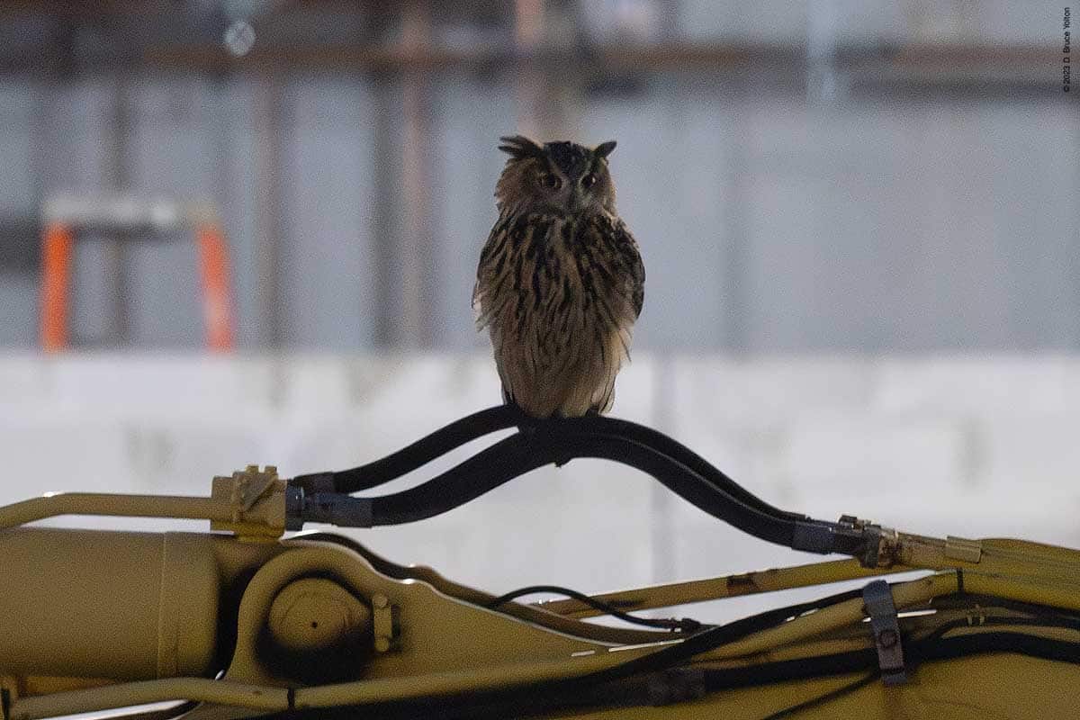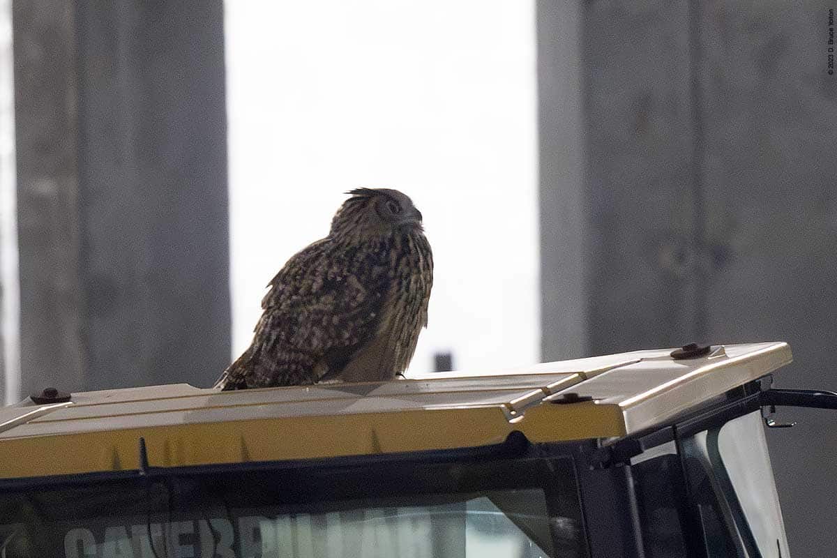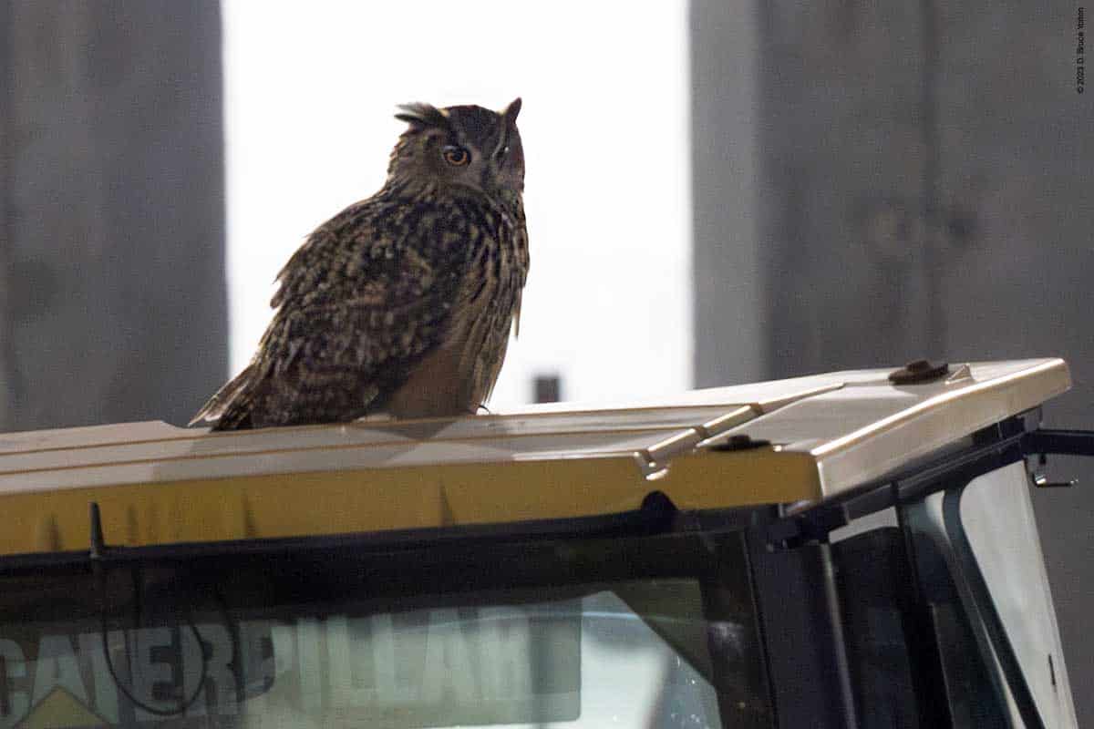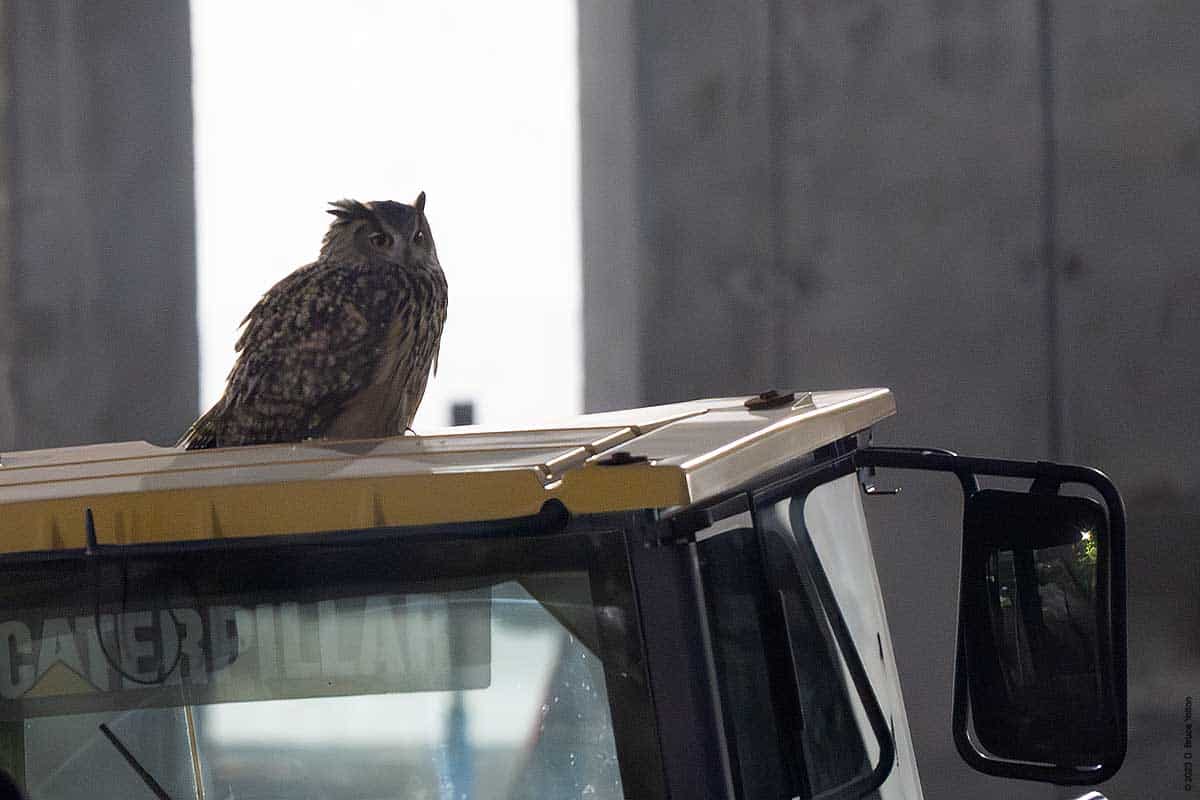 Over the last month, enough work has been done to allow the night watchman for the construction to now go over the roof walkway, through the building and then check on the equipment located where the rink/pool will eventually be built. However this means that while making his rounds, he sometimes flushes Flaco. Now that the route is longer, Flaco seems to be getting flushed more often.