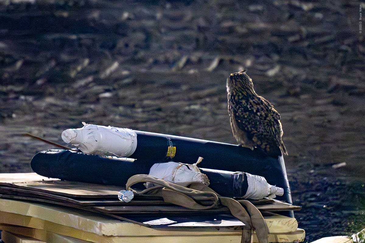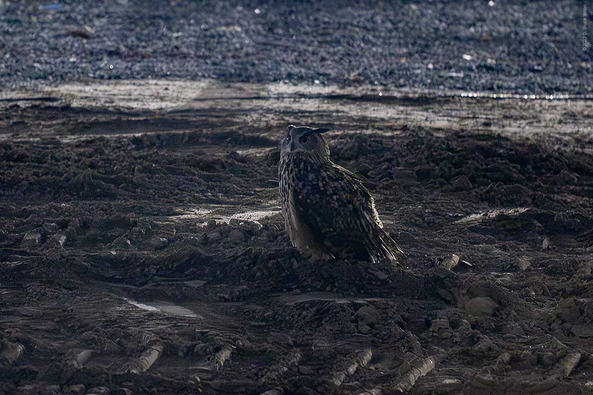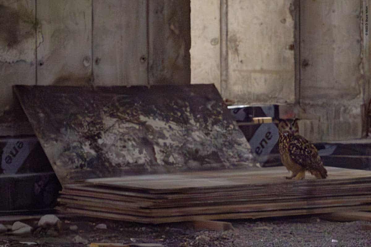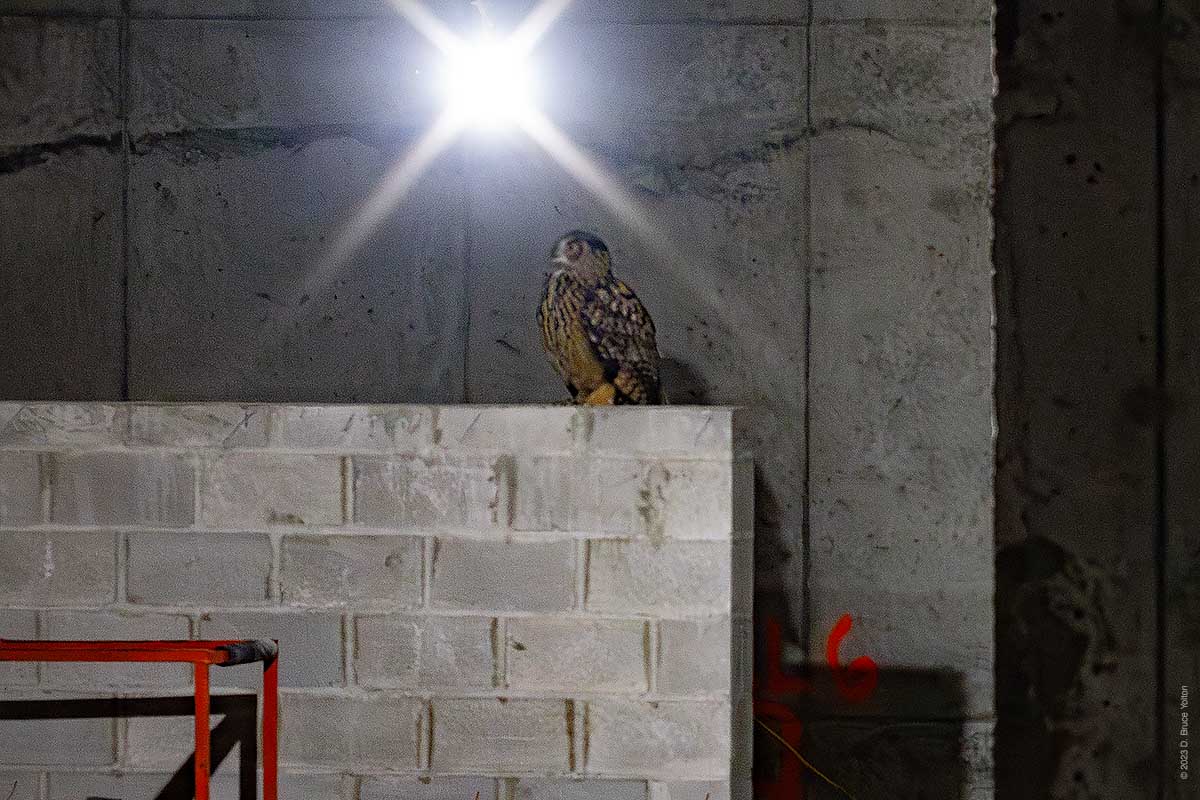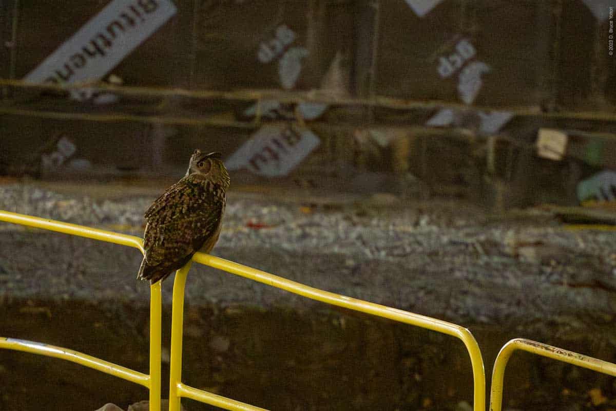 He got flushed by the night watchman, while hooting and then ended up hooting from a tree east of the constructions site. Since he’s often gone out of the construction site and up to the compost heap, the three of us watching him made the hike up the hill to look for him. It was late, so everyone decided to go home. I left via the constructions site, as I can catch my bus from 110th Street.