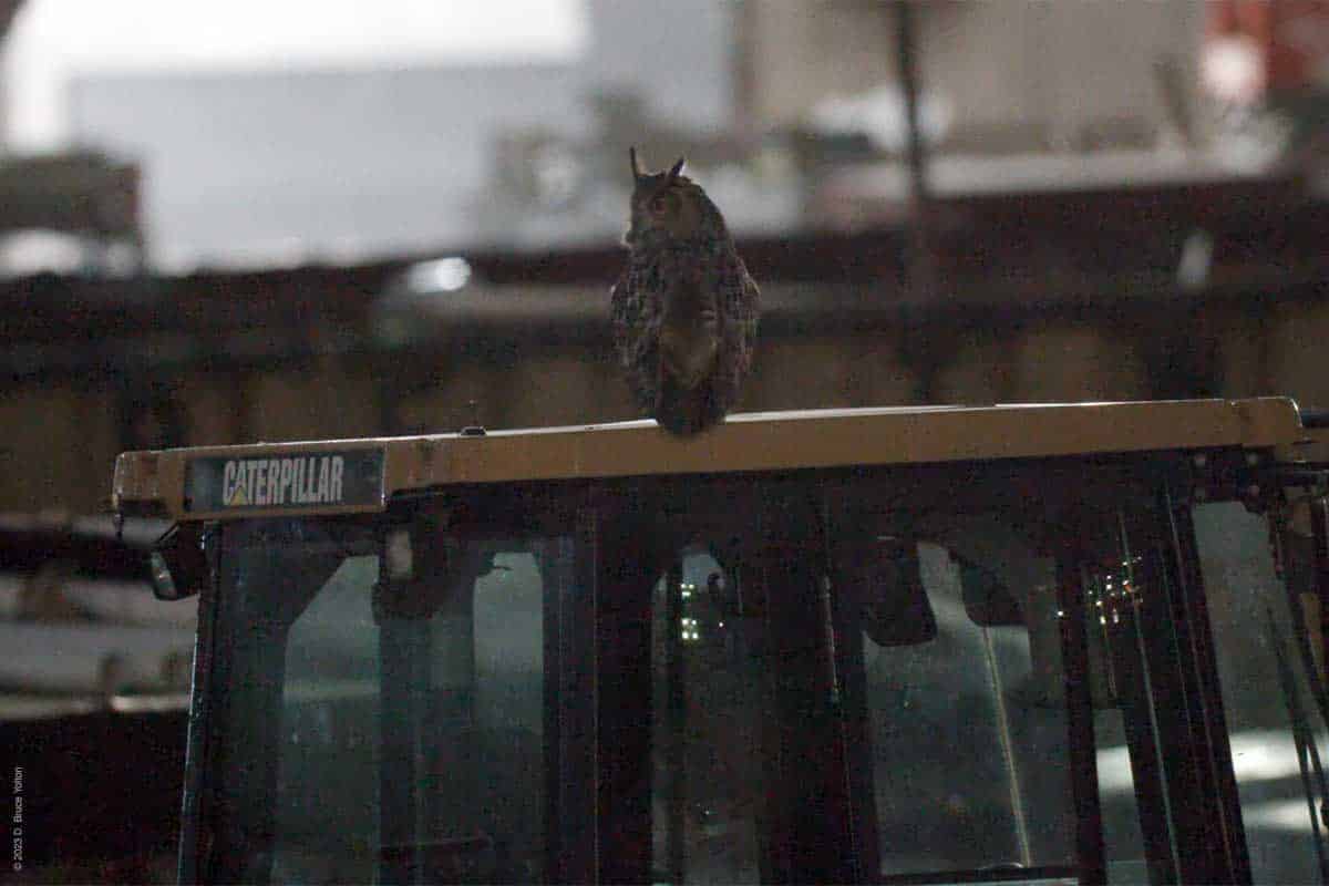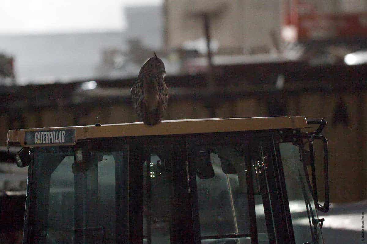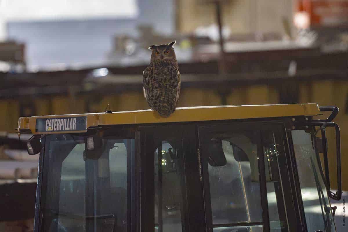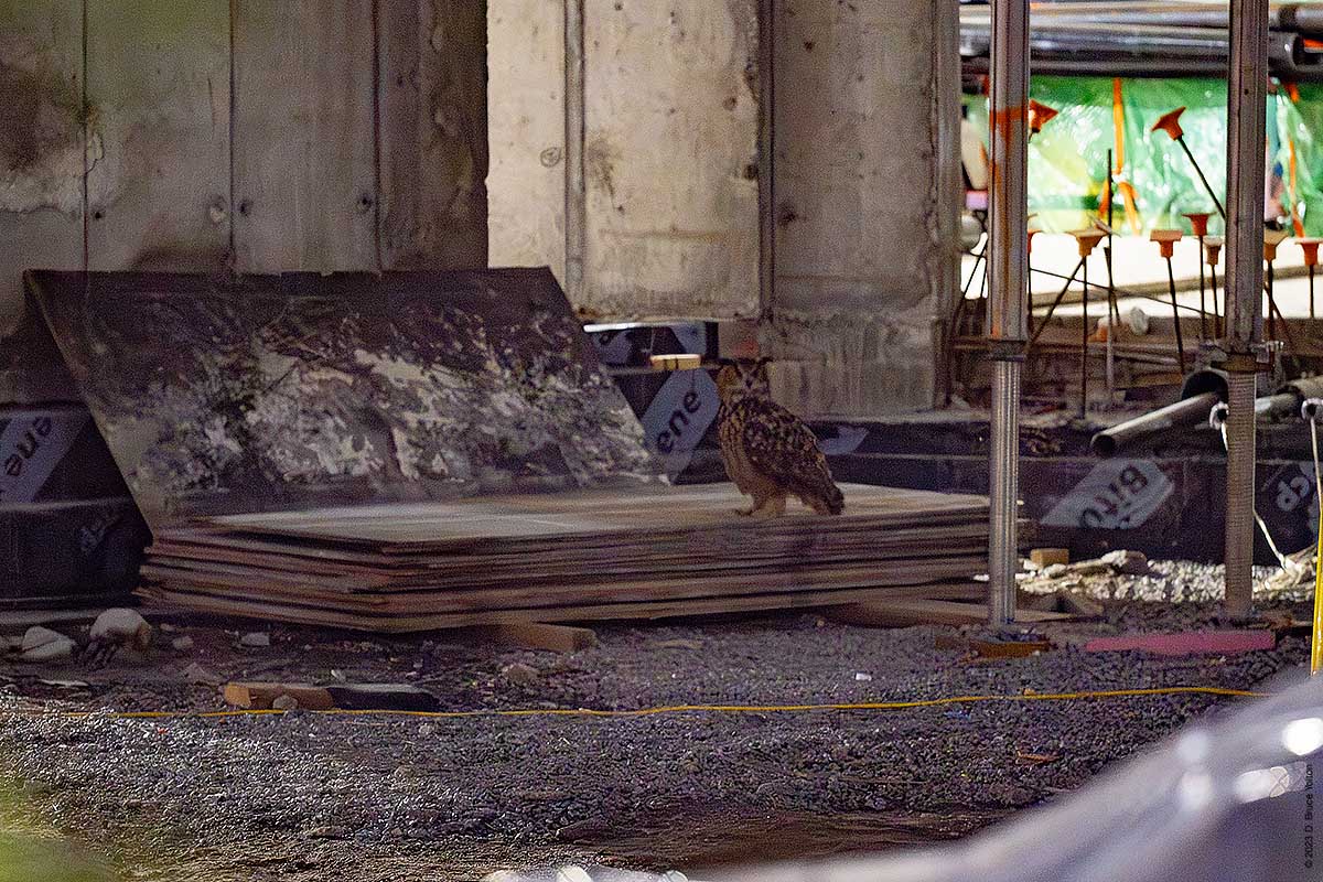 In the evening, I caught up with him at the construction site for the new rink/pool by the Harlem Meer. He was often on the ground, equipment or a barricade. He also was on the roof, on the steps and under the construction trailer. He also hooted.