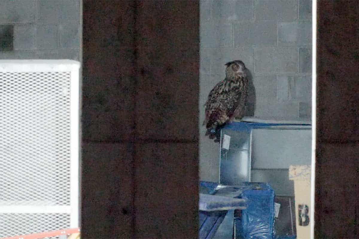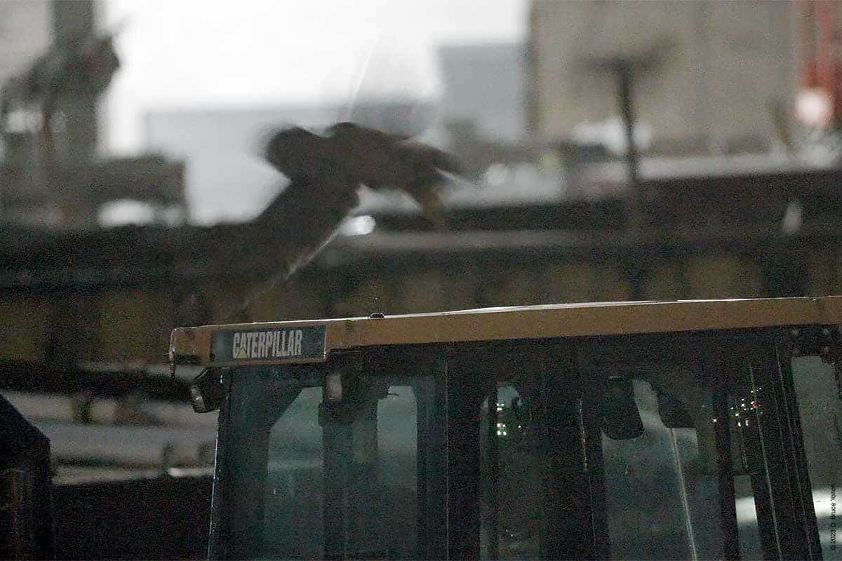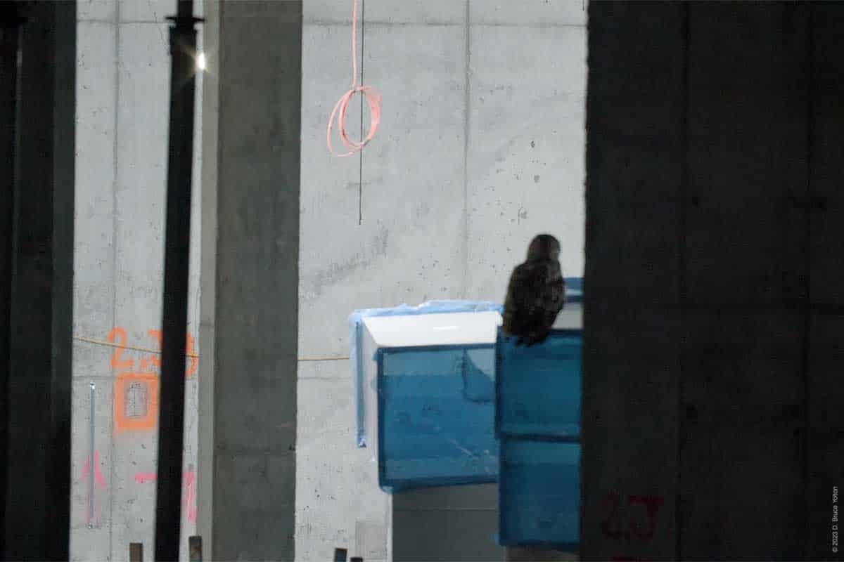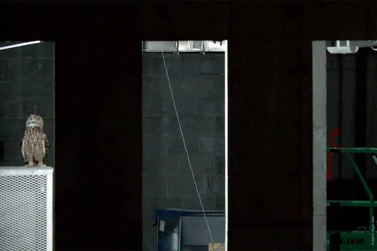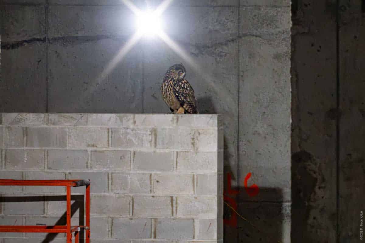 On my way out, with my camera equipment in my bag, I saw that he had returned to the construction site. But he was inside the new building on a stack of metal ducts waiting to be installed wrapped in a blue film. He then flew around the inside of the building. He was hidden most of the time, but I got to see him on four perches. I was still setting up my camera, so my video was at times shaky or out of focus, but it was fascinating to see him inside the building. So, on this night Flaco was a Building Inspector.