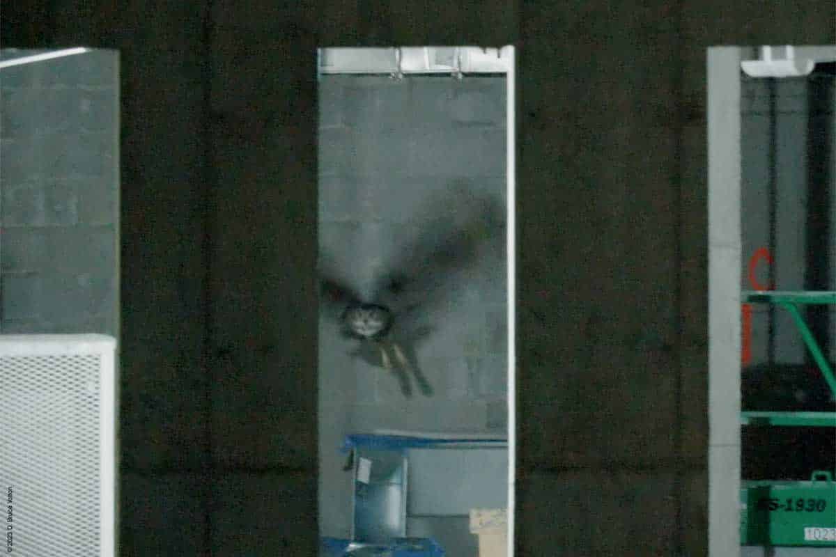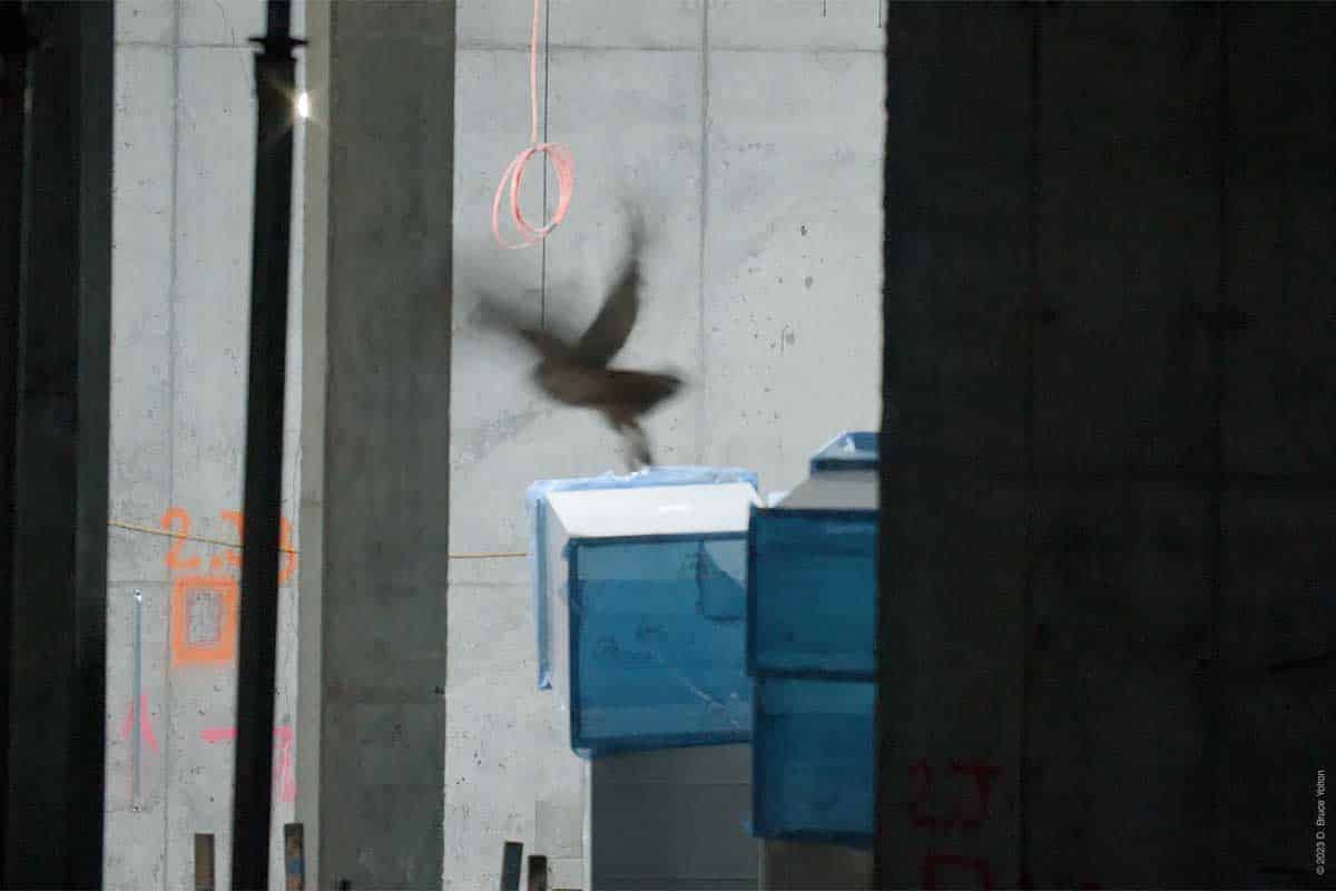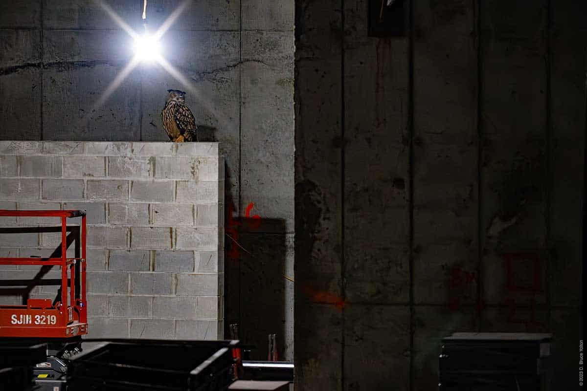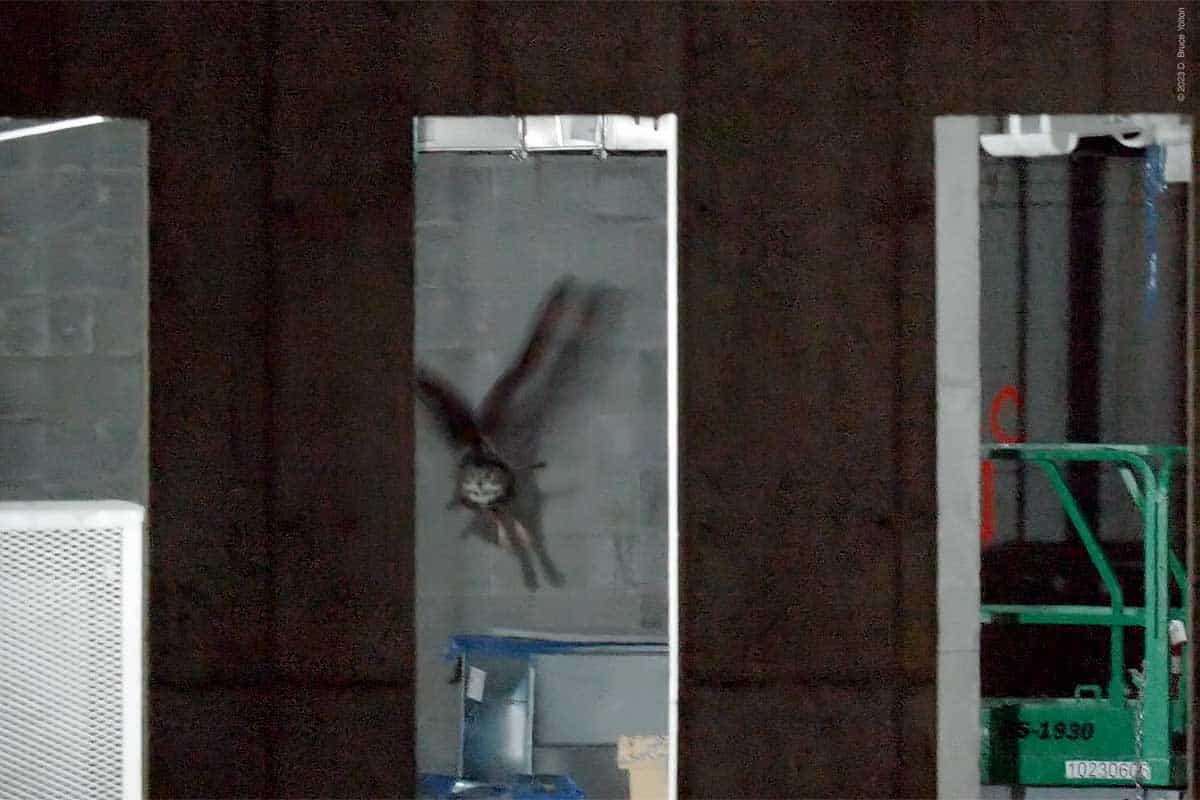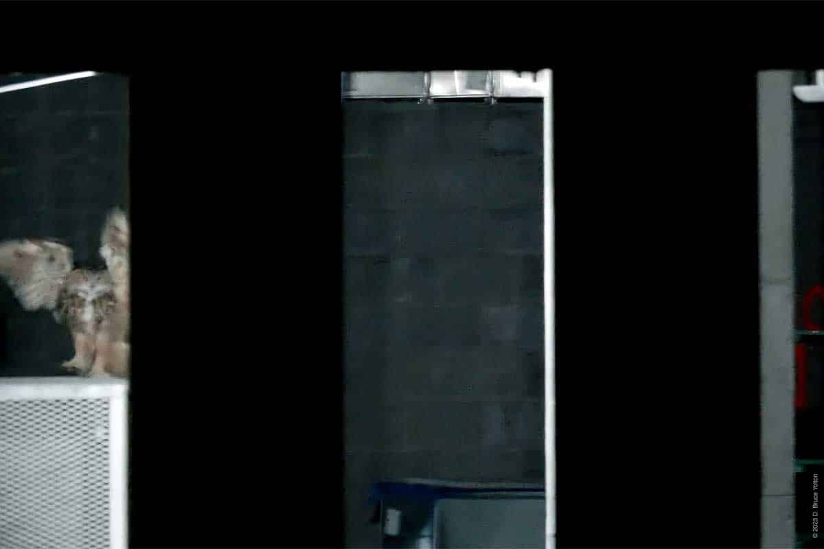 On my way out, with my camera equipment in my bag, I saw that he had returned to the construction site. But he was inside the new building on a stack of metal ducts waiting to be installed wrapped in a blue film. He then flew around the inside of the building. He was hidden most of the time, but I got to see him on four perches. I was still setting up my camera, so my video was at times shaky or out of focus, but it was fascinating to see him inside the building. So, on this night Flaco was a Building Inspector.