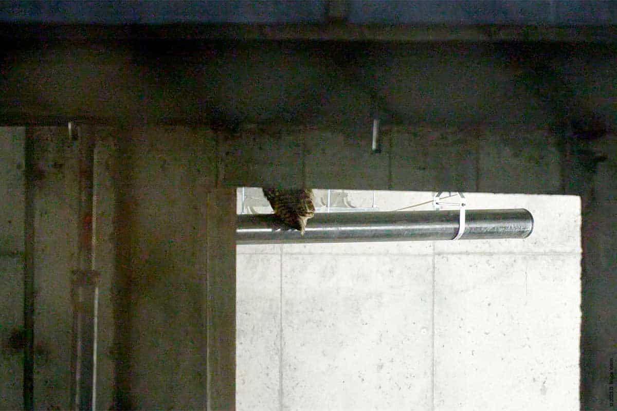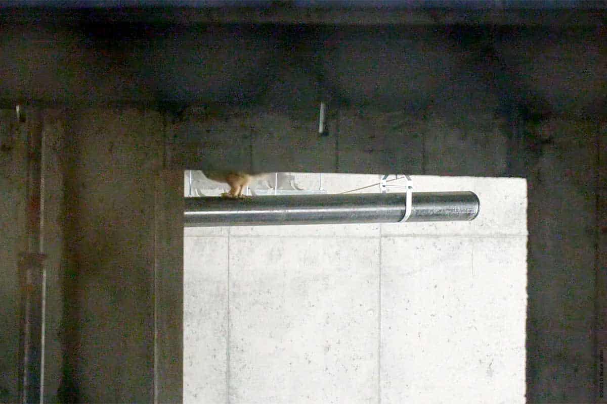 He was in on of his normal roost trees and flew out to a lamp post. He got mobbed by a bird and decided to return to a branch on his roost tree before flying south. He flew quickly to the construction site. He’s been exploring the inside of the building, and was on an orange lift, before flying out of the building to a little mound of dirt. He then flew up to a pipe inside the building where we could only see his tail and feet.