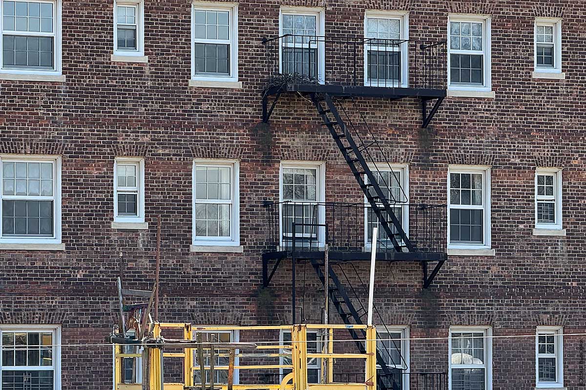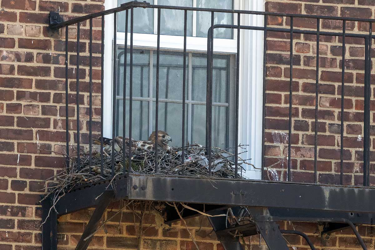 This year the Governors Island Red-tailed Hawks have nested on a fire escape above play:groundNYC’s The Yard, a children’s playground. The female was on the nest and the male kept watch from the flagpole of St. Cornelius Chapel.