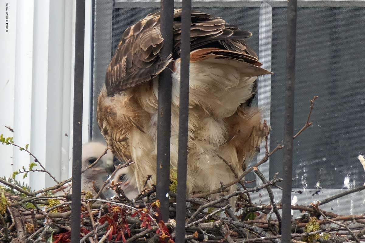 Governors Island Update By D. Bruce YoltonApril 19, 2024April 19, 2024Governors Island Red-tailed Hawks The Governors Island nest, which is above The Yard, a playground on the island, has two eyasses and seems to have hatched 7-10 days ago. I saw two visits from the male and two feedings late in the afternoon.