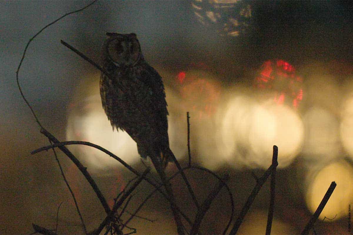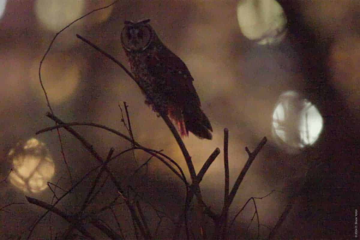 The remaining owl chose a new roost for the day in a tree just to the west of its previous tree. At fly out, it went to the hill between the nursery and compost, and most likely caught and ate a mouse. It then went to a pile of brush next to one of the compost dumpster and hunted before flying off to the west.