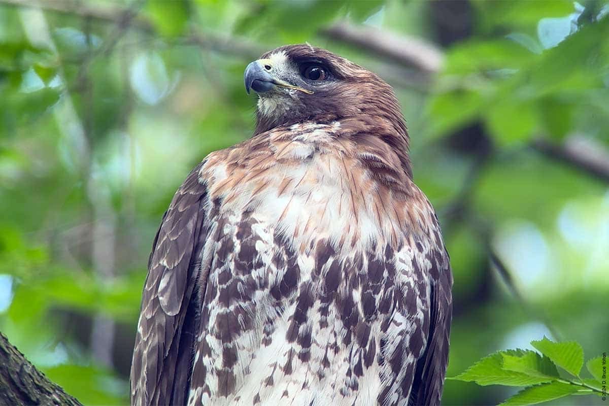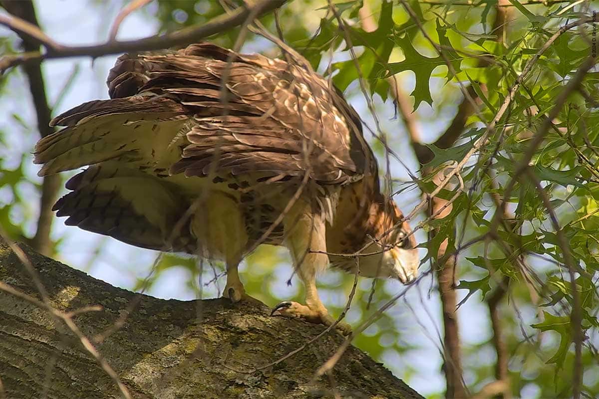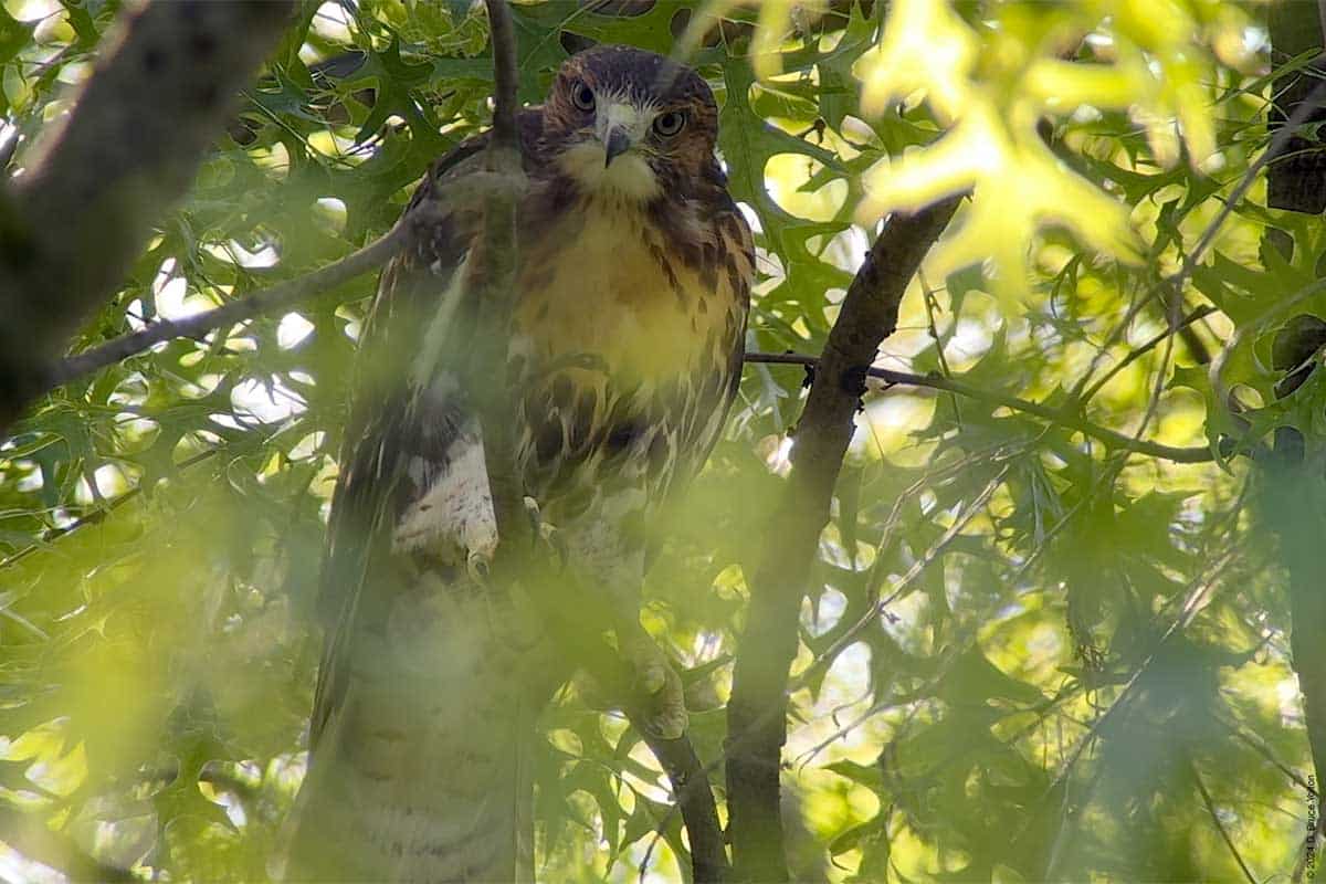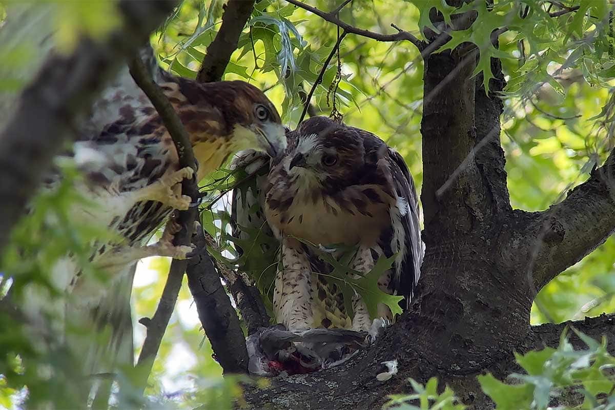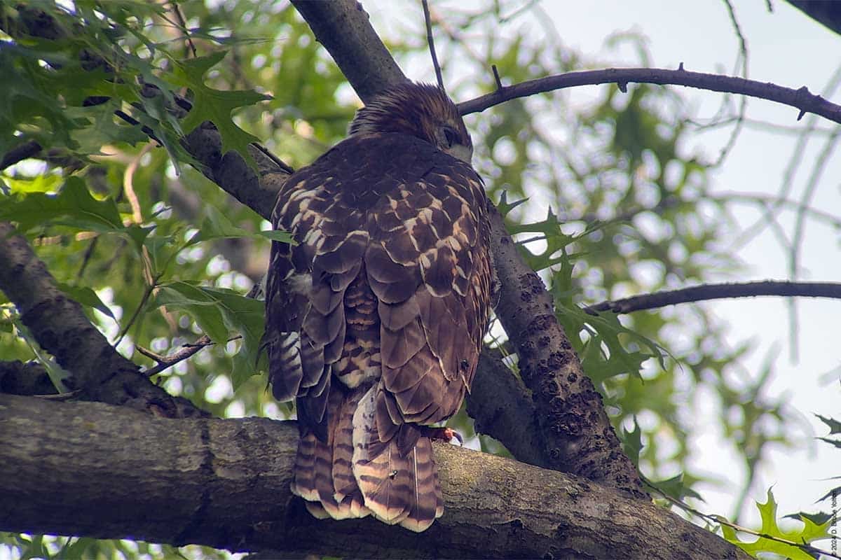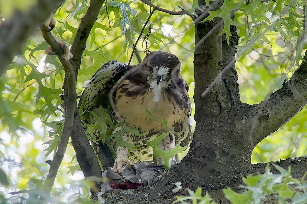 On Tuesday, I was lucky to find two of the fledglings eating in an oak tree just inside Central Park. There mother was keeping watch from a nearby tree. One fledgling patiently waited until the other was done eating to eat the leftovers.