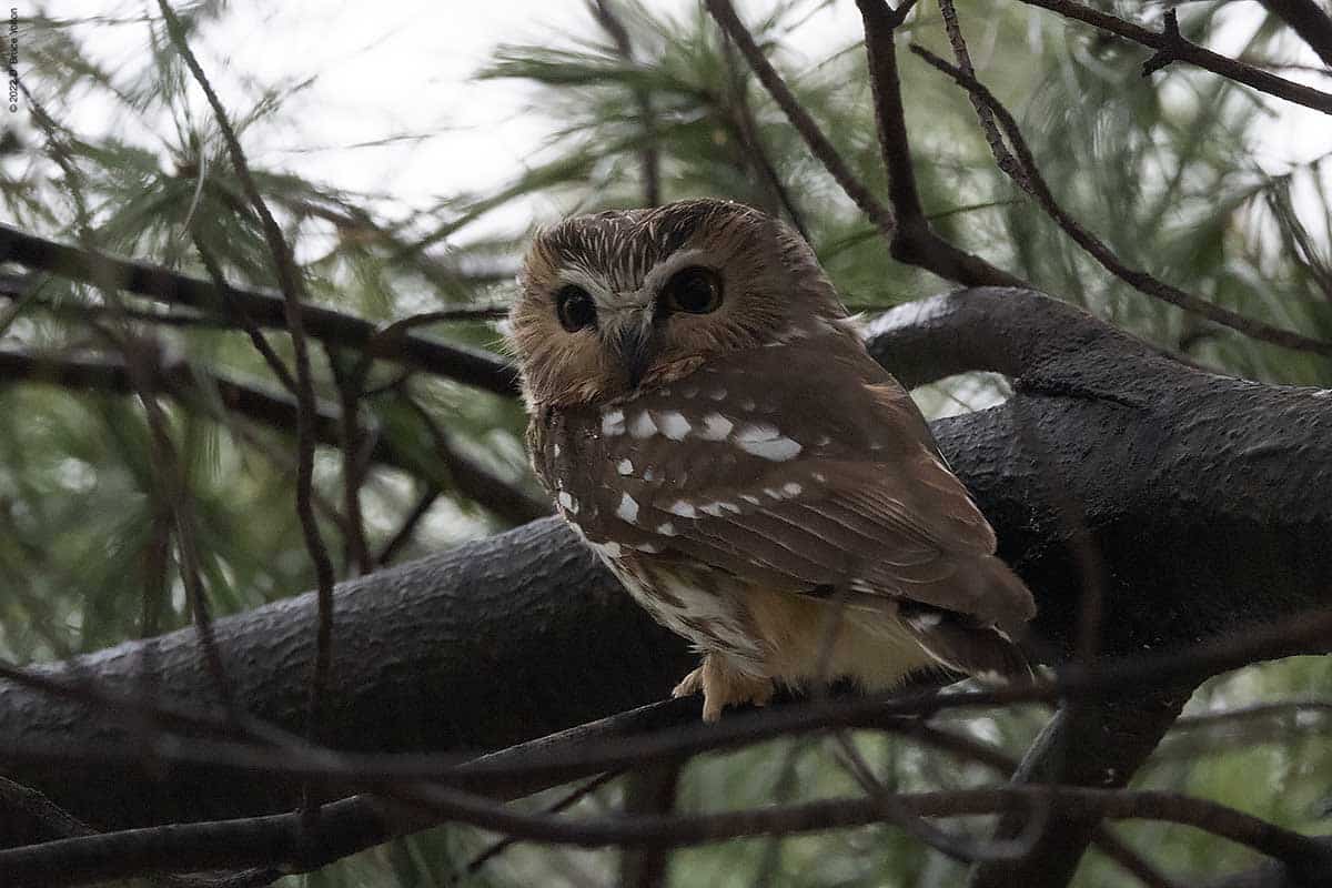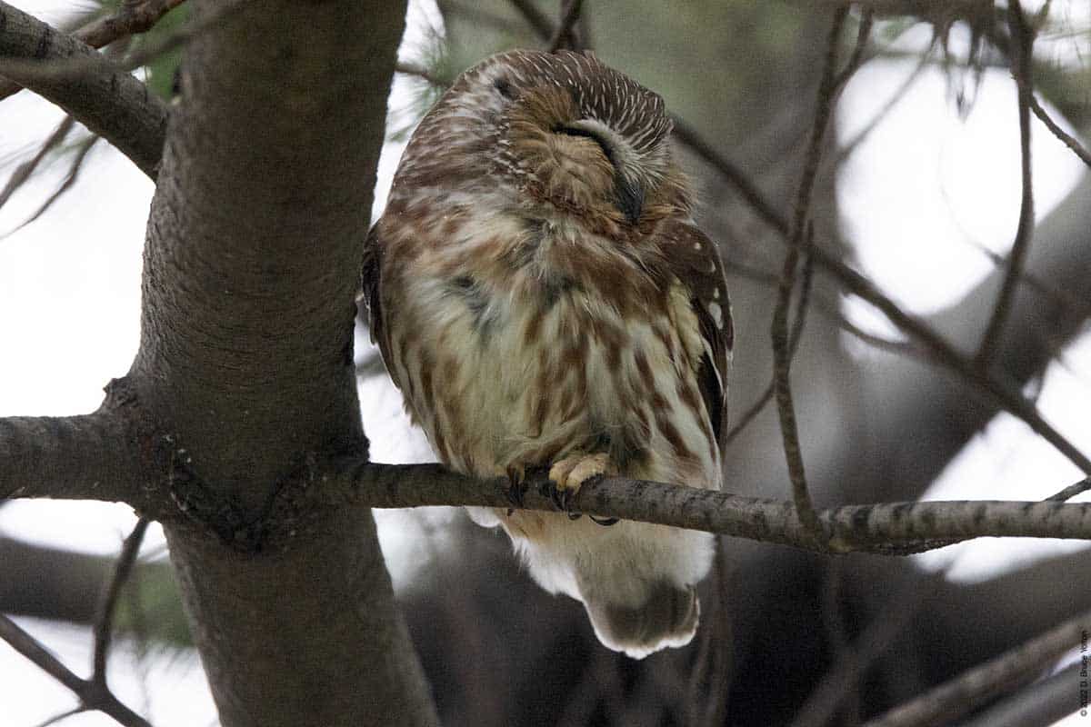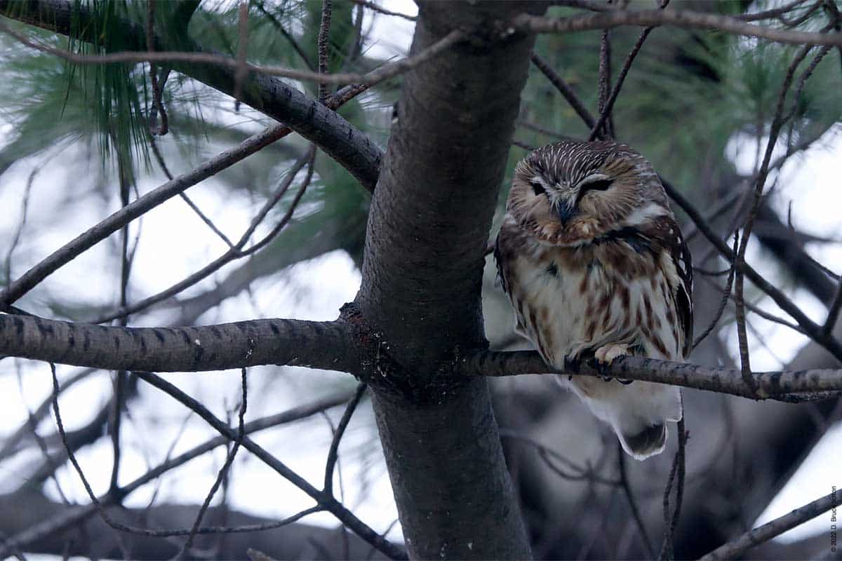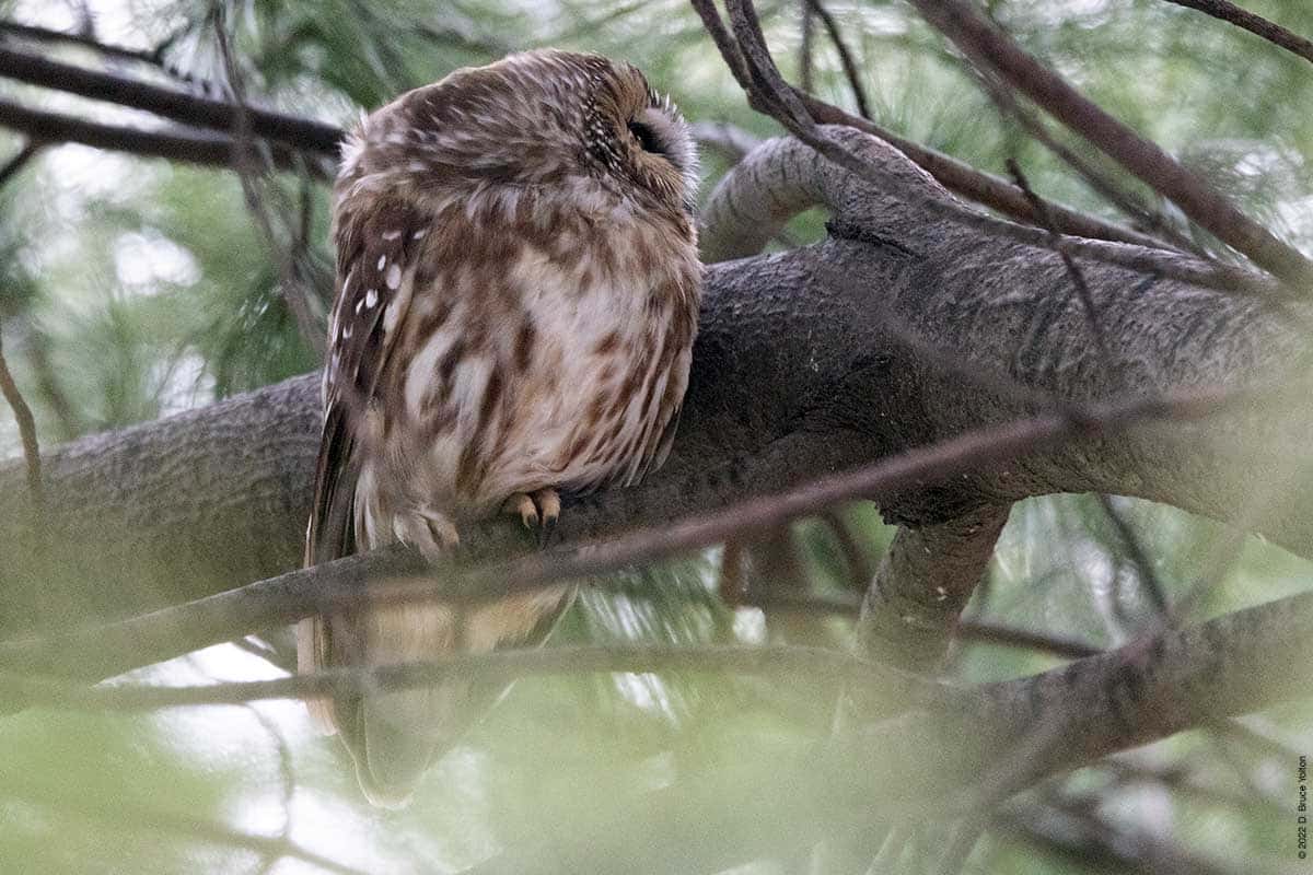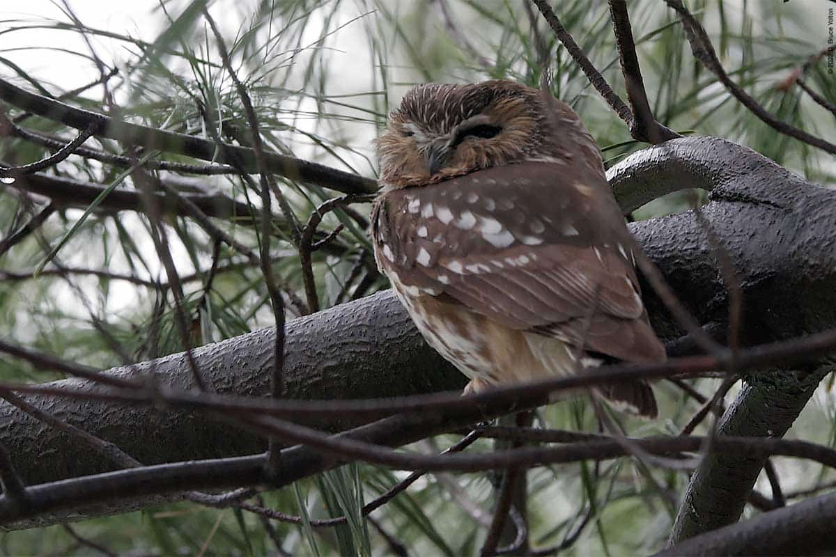 There were only a few folks watching the owl while I was there. The observers kept their distance, were quiet and enjoyed great looks at the Saw-whet. It was nice to see everyone being so respectful. None of us had to worry about waking the owl up however, as it was wide awake dealing with the wind!