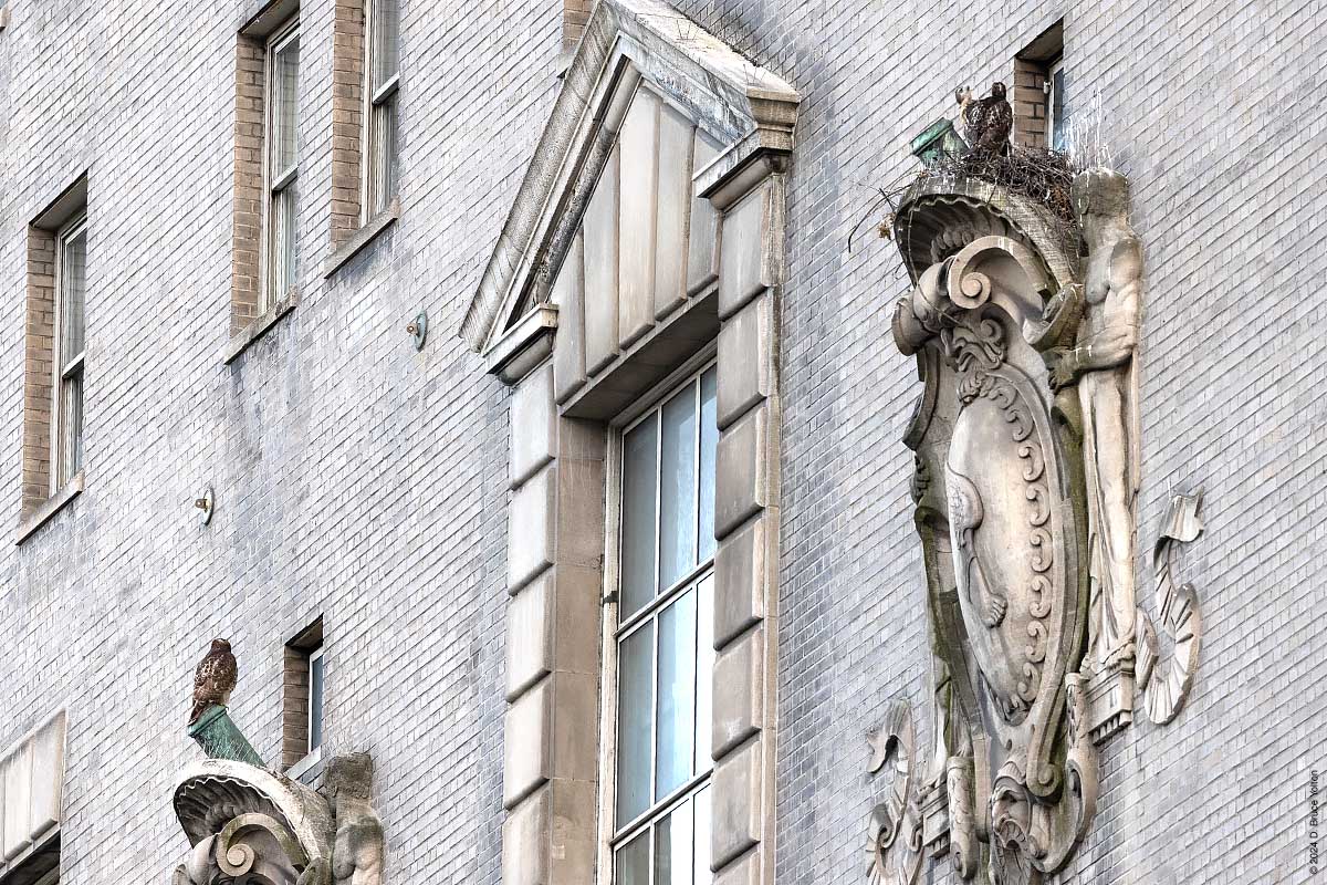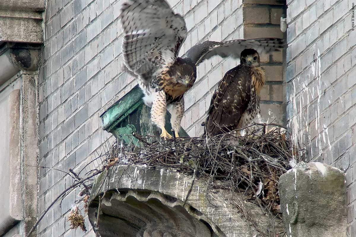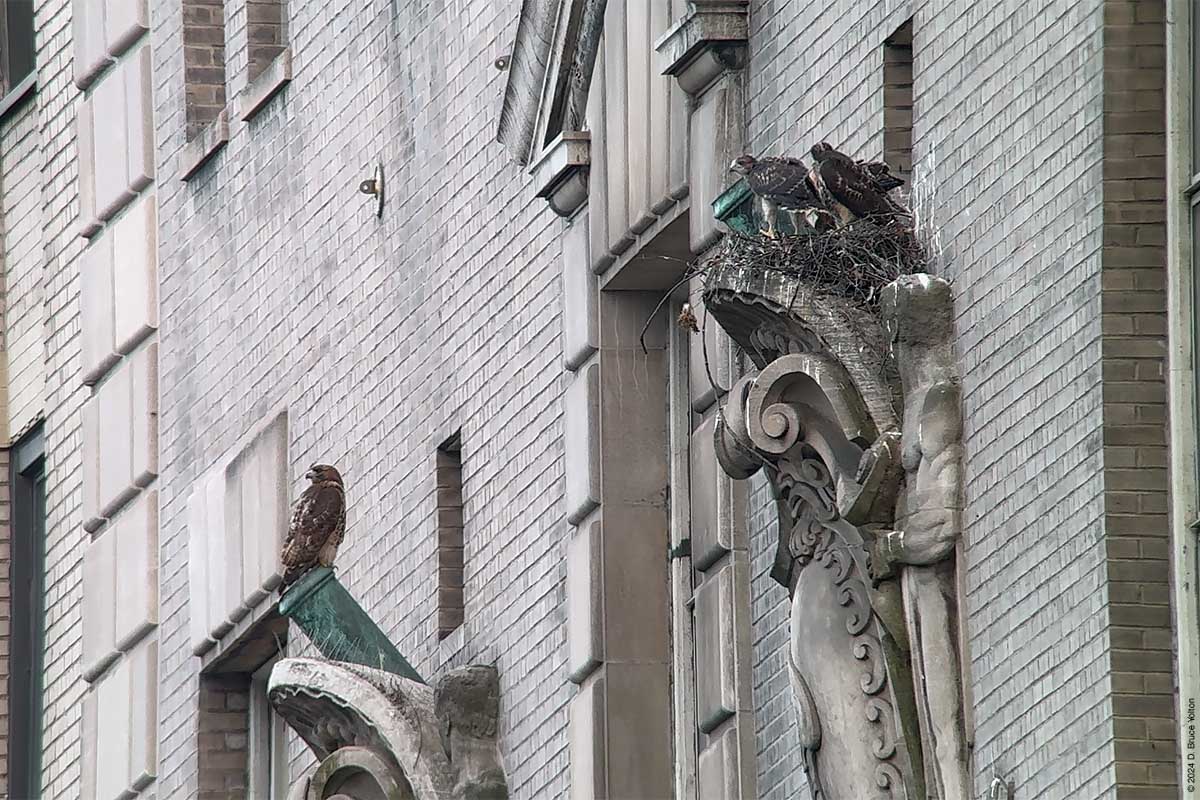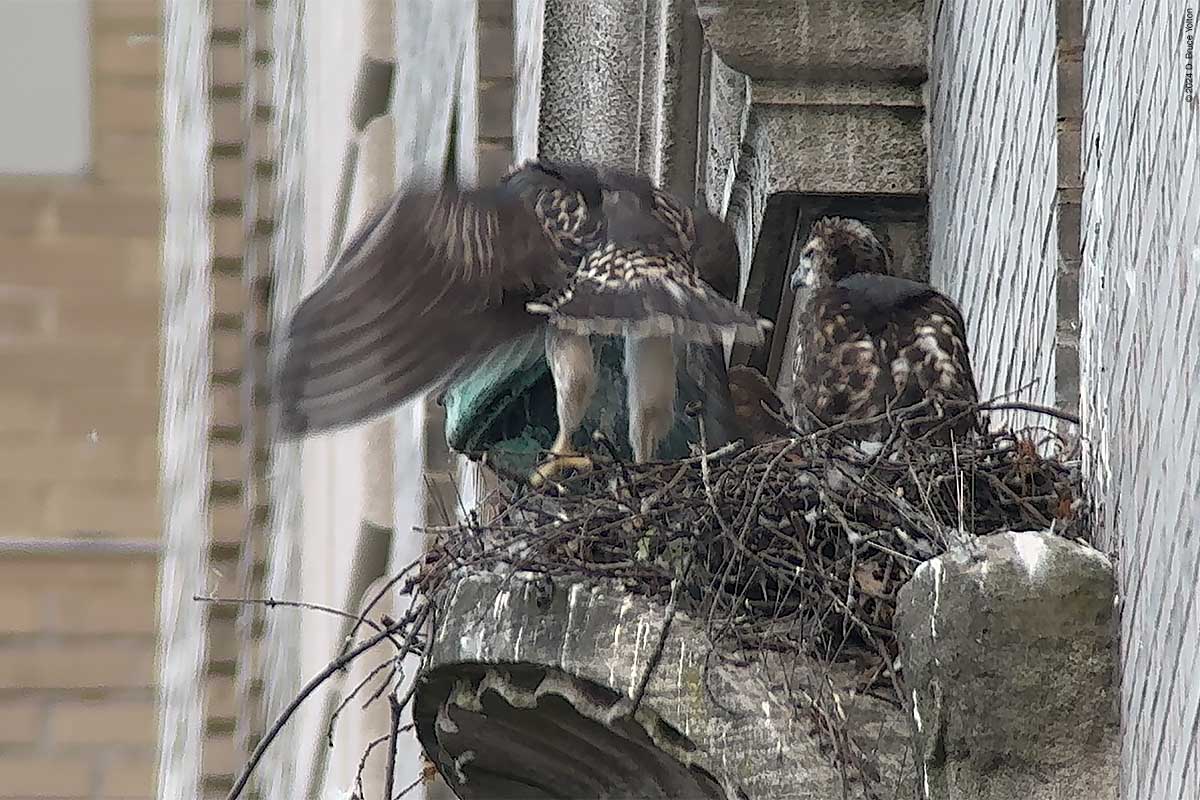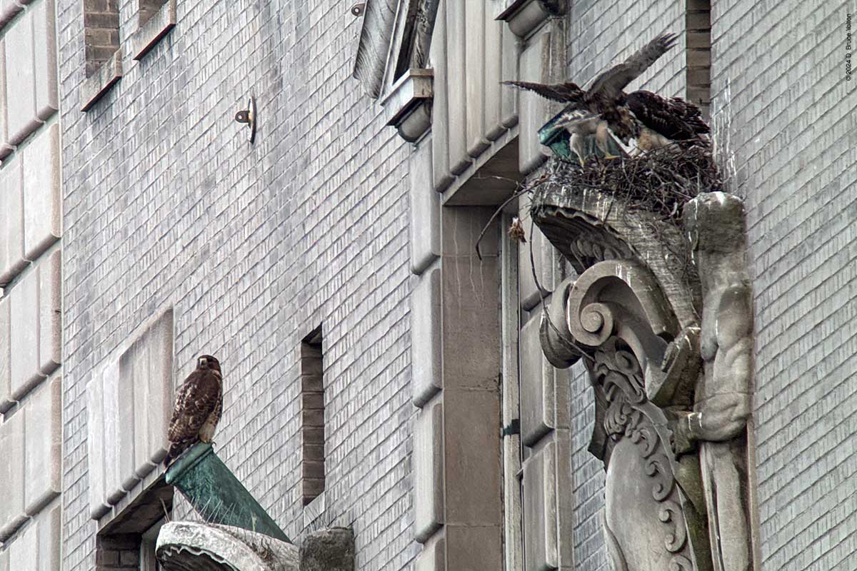 I only had about an hour after dinner to watch the New York Athletic Club nest. The mother was on the eastern shield of the building asking as a target for the Blue Jays that harass the hawks in the late evening when I arrived. At some point the father brought in prey, landing and leaving in under a minute. The mother then came in to help feed the eyasses and then hopped up on the unused mount for a flag pole. At this point it was getting too dark to take anymore pictures. I’m looking forward to the young hawks being in the southern section of Central Park this summer.