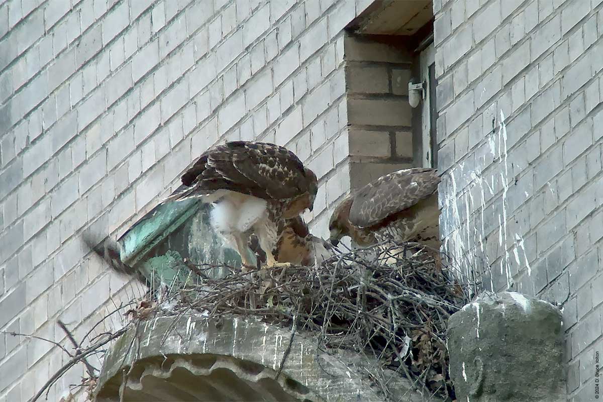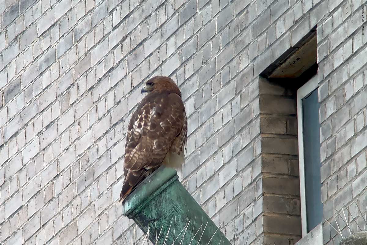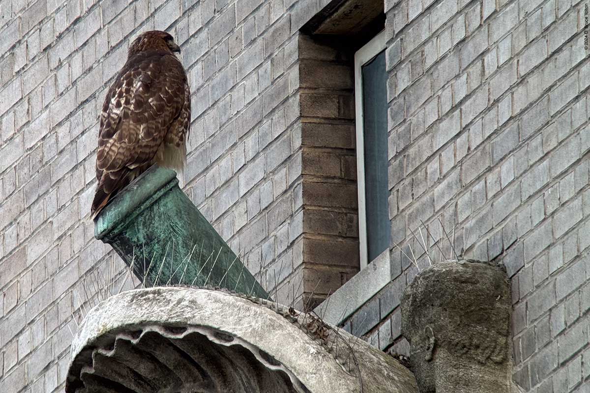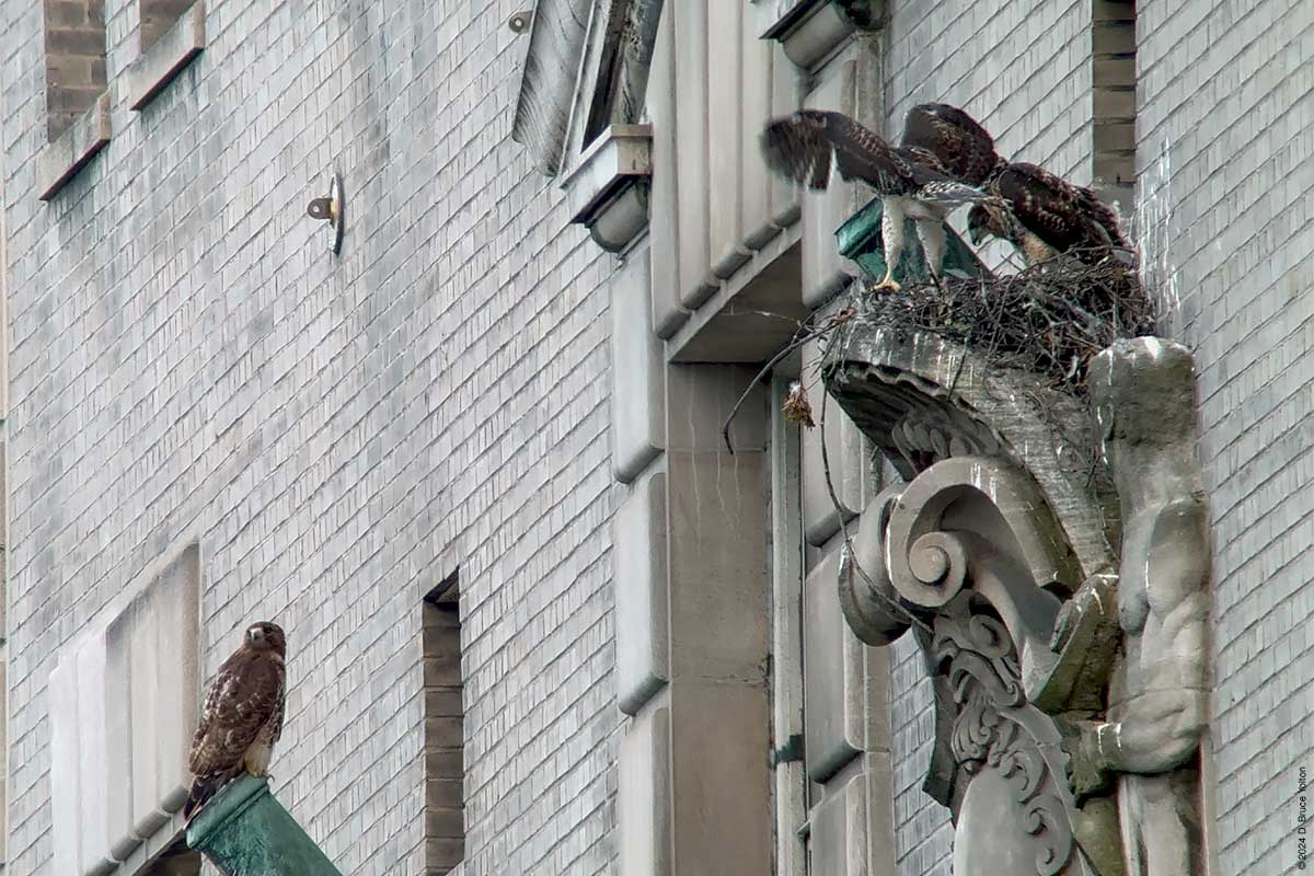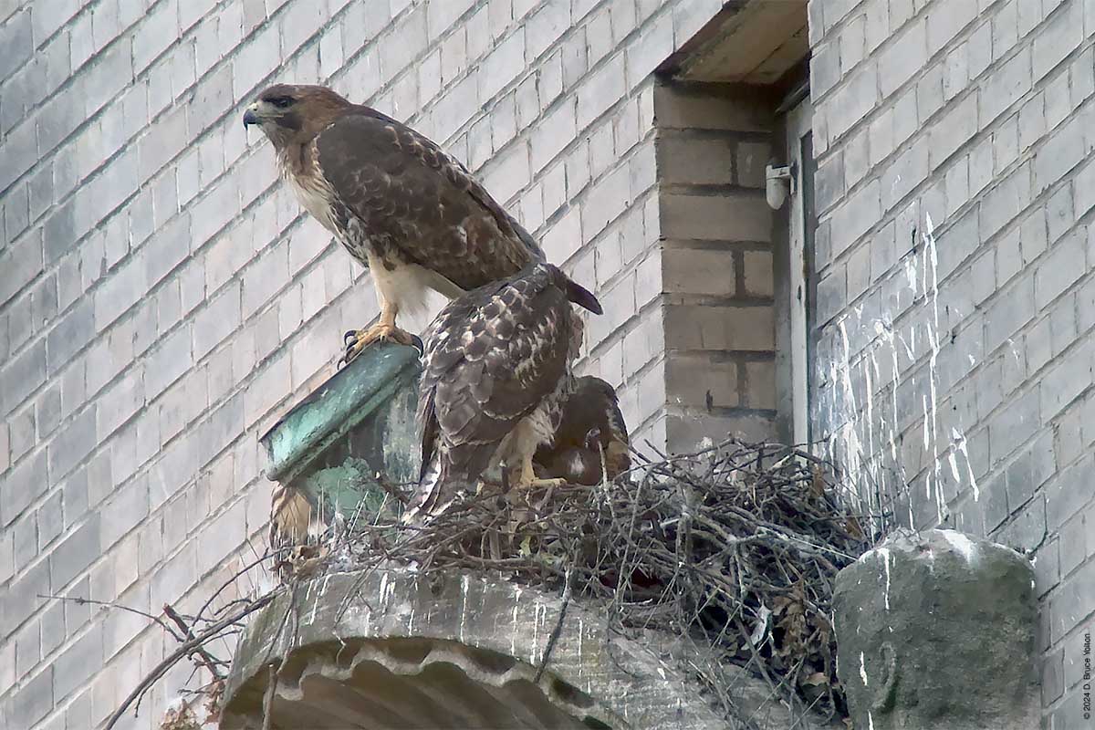 I only had about an hour after dinner to watch the New York Athletic Club nest. The mother was on the eastern shield of the building asking as a target for the Blue Jays that harass the hawks in the late evening when I arrived. At some point the father brought in prey, landing and leaving in under a minute. The mother then came in to help feed the eyasses and then hopped up on the unused mount for a flag pole. At this point it was getting too dark to take anymore pictures. I’m looking forward to the young hawks being in the southern section of Central Park this summer.