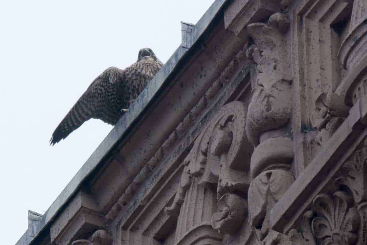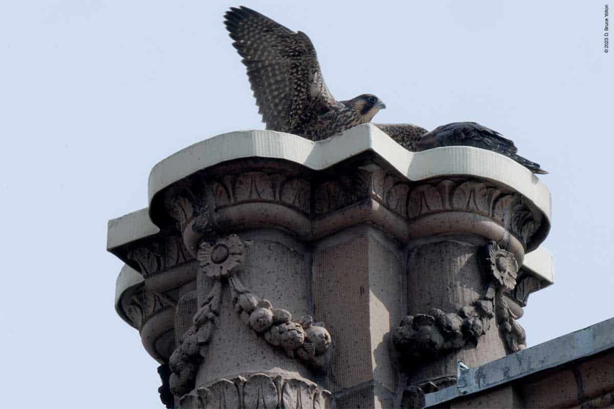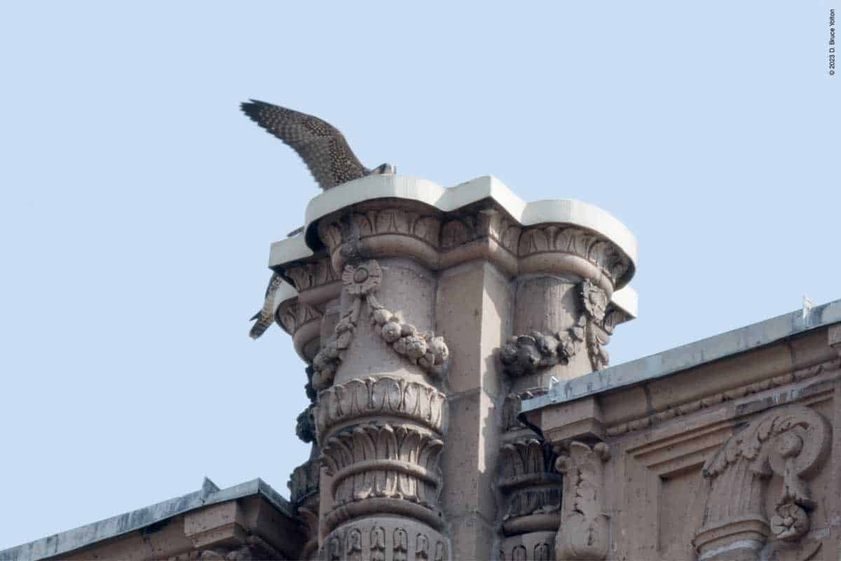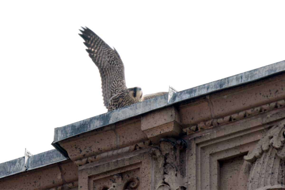 Then one fledgling, and then a second appeared on top of 530 West End Avenue, with the adult male also making a visit. One fledgling made a few strong flights, possibly following a parent. Eventually, as I was packing up to go home, food was delivered to 530 West End Avenue. Then two birds flew down to the tower. It wasn’t clear, but it looked like two fledglings.