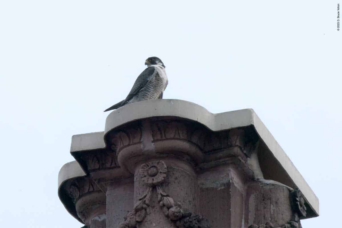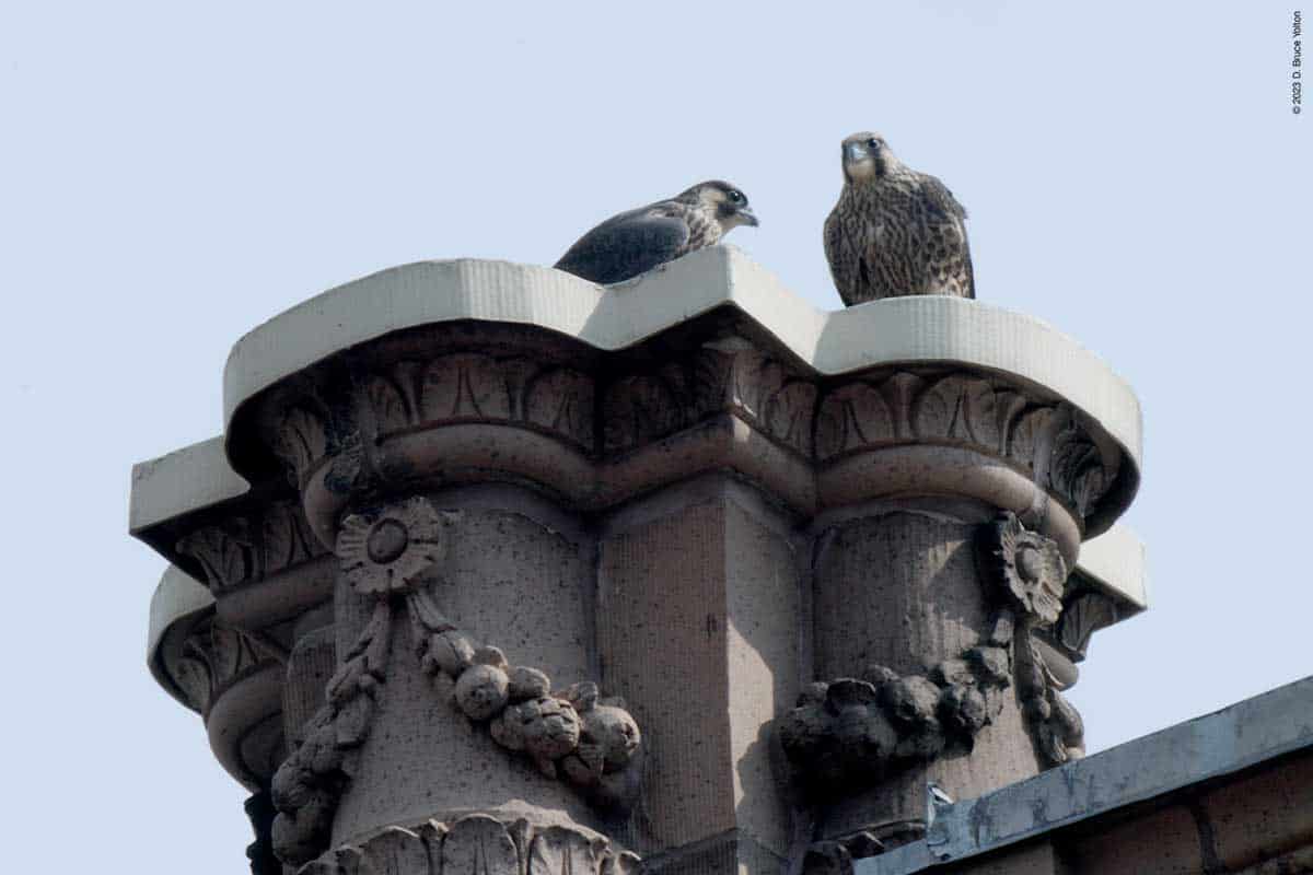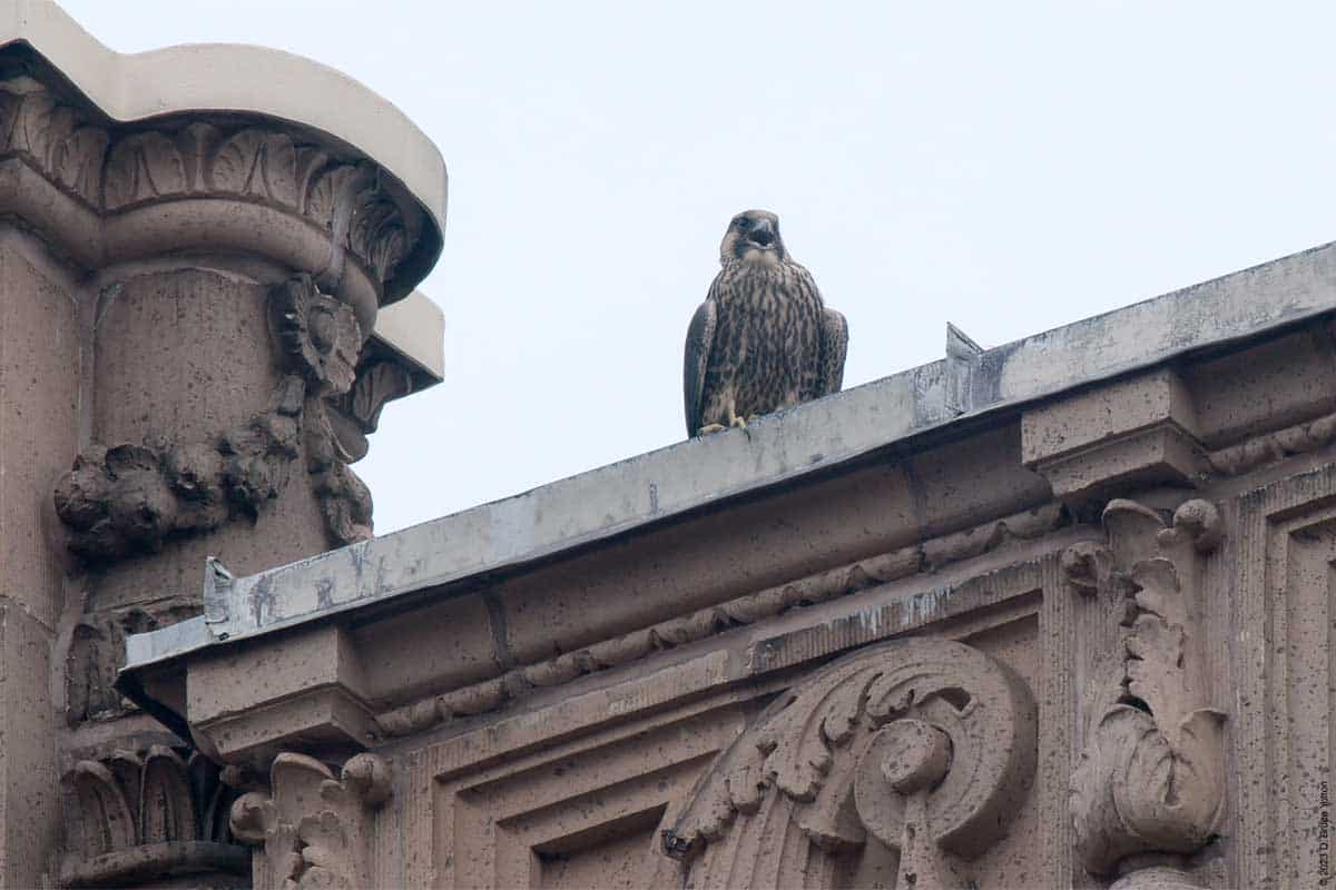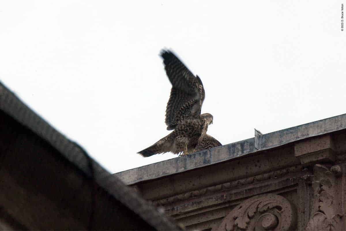 Then one fledgling, and then a second appeared on top of 530 West End Avenue, with the adult male also making a visit. One fledgling made a few strong flights, possibly following a parent. Eventually, as I was packing up to go home, food was delivered to 530 West End Avenue. Then two birds flew down to the tower. It wasn’t clear, but it looked like two fledglings.