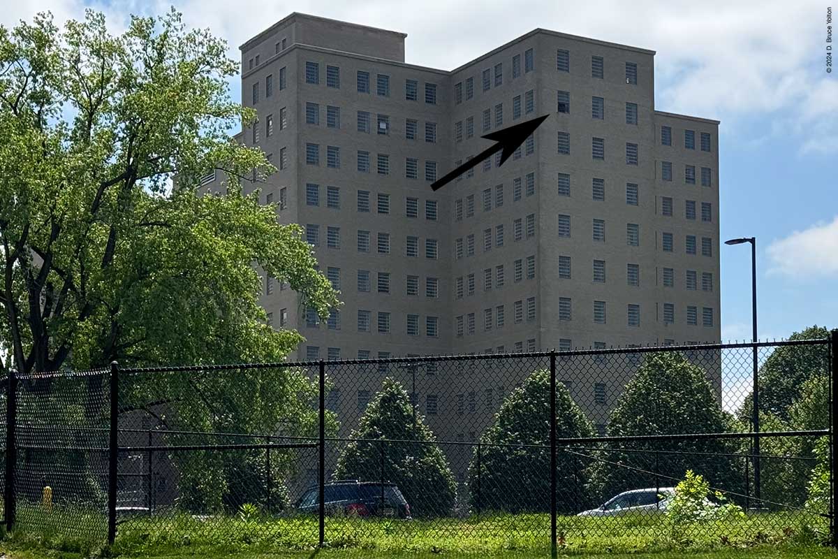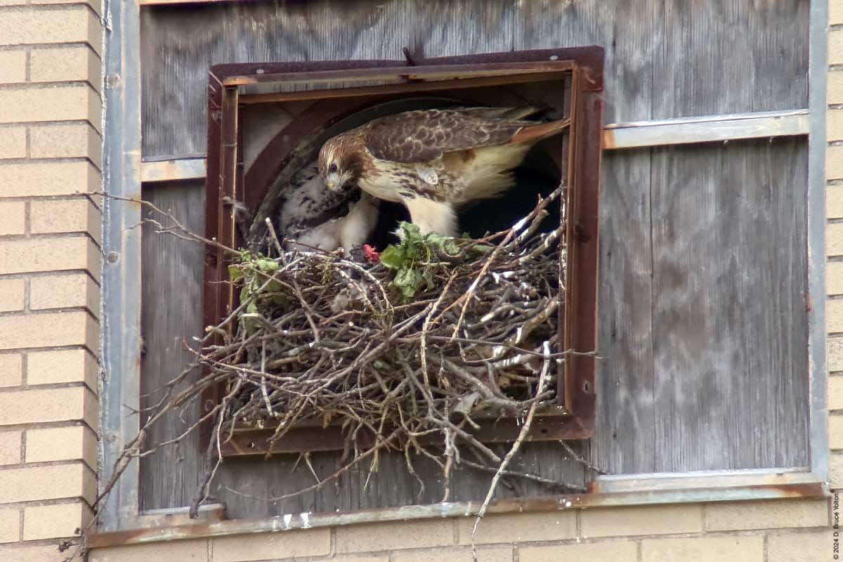 Ben Cacace let me know of a Red-tailed Hawk Nest on Randalls Island a few weeks ago, but I finally had a chance to see it on Monday. It is one floor down from the top of the southern most tower of the Manhattan Psychiatric Center, 105 Rivers Edge Road, on the western wing’s western facade.