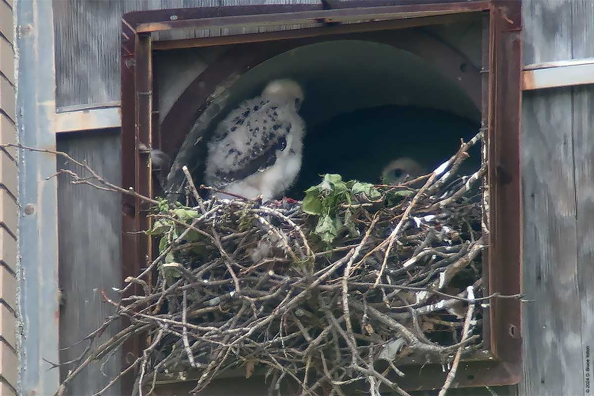 The nest is deep in an exhaust pipe of some sort and is difficult to see into. It appears there are two eyasses. I got some poor video of a parent and the young ones quickly shot when I arrived. Once I got fully set up, the young ones went to sleep out of view so I was unable to record more video.