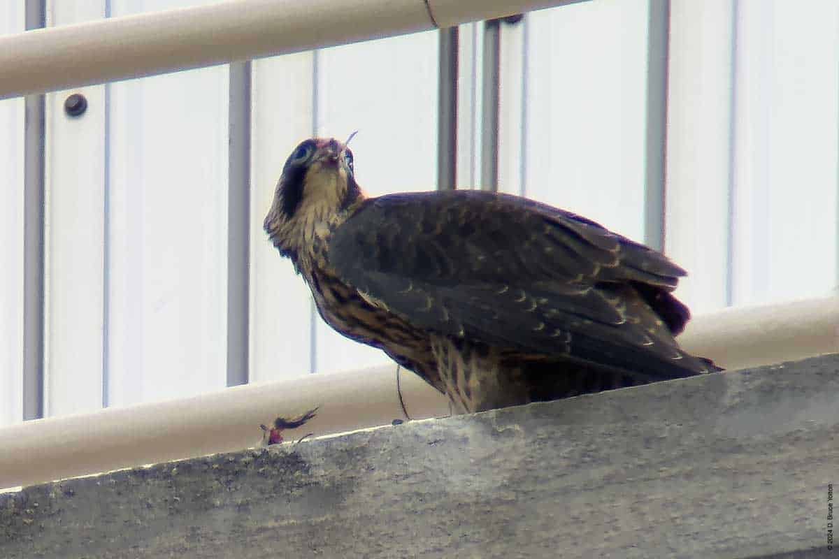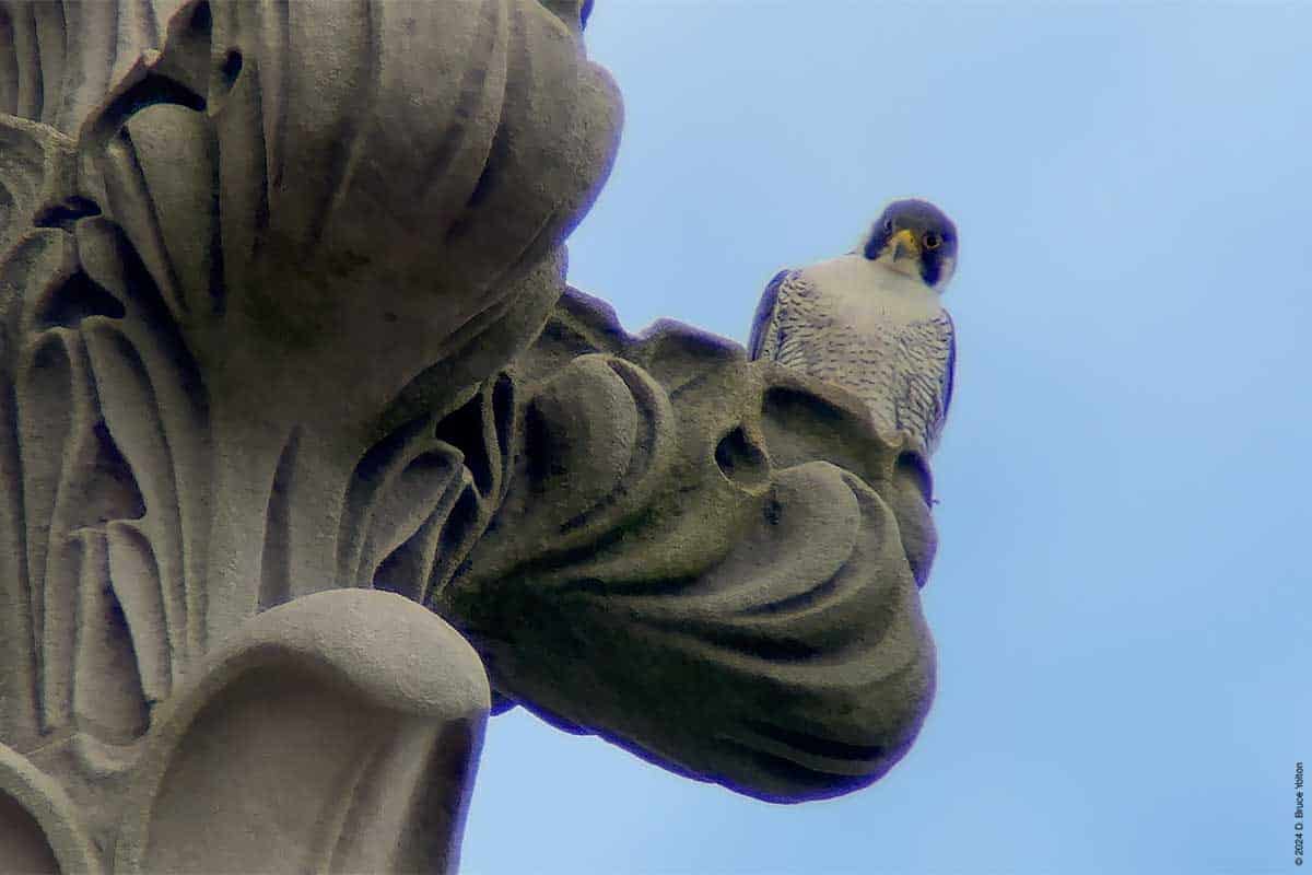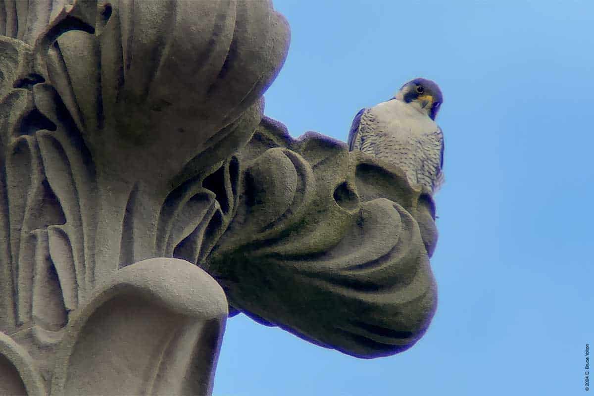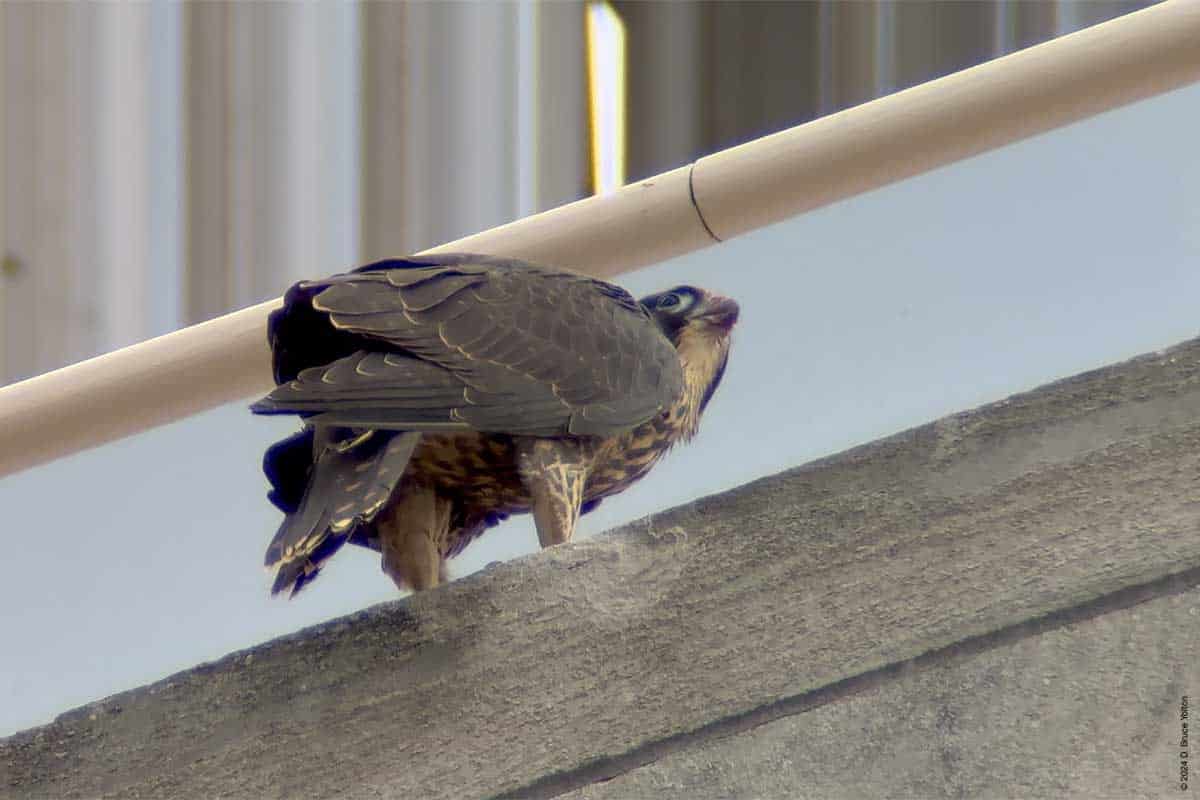As in years past, the Riverside Church Peregrine Falcon fledglings have moved to the Interchurch Center, a block south of the church. I saw at least three of the fledglings and both parents on the building. The parents also perched on the church.