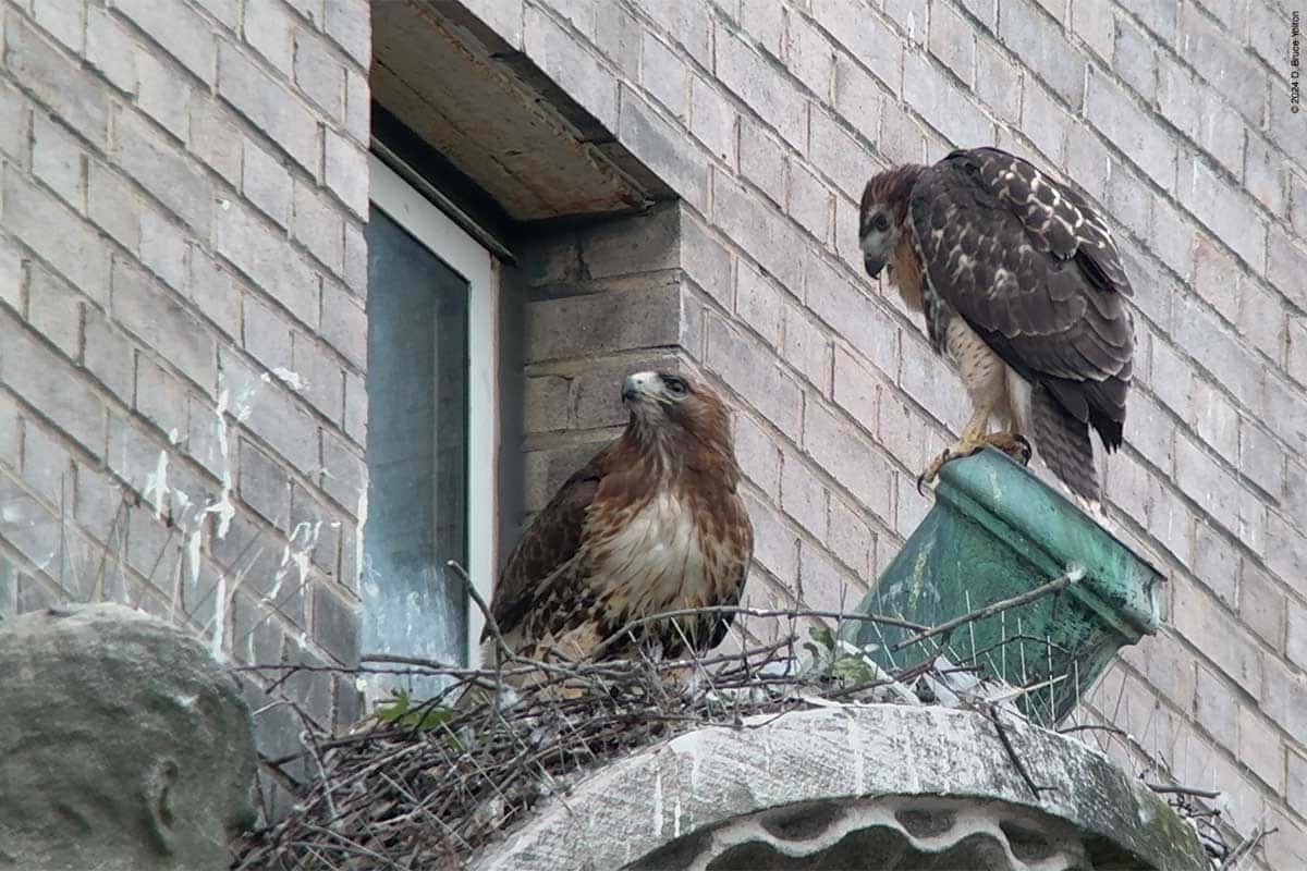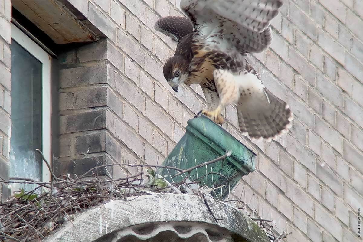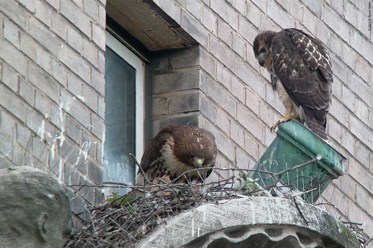The adult female who watched all this perched first on the Essex House, before perching further west. She eventually joined the remaining eyass on the nest and had a snack.